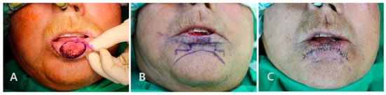 - Chai, K.; Liu, J.; Xiao, R.; Zhang, G.; Zhan, Y. A huge verrucous carcinoma of the lower lip reconstructed by double Abbe flap: A case report and literature review. Front. Oncol. 2023, 13, 1086963. [Google Scholar] [CrossRef] [PubMed]