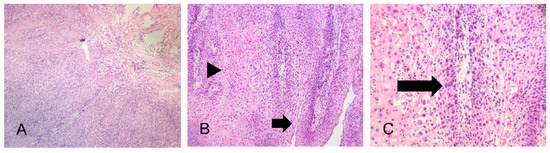 Histopathologic examination of the excised specimen revealed a well-differentiated verruciform squamous proliferation with an exo–endophytic architecture (Figure 4A–C). Broad, bulbous rete ridges extended deeply into the underlying stroma and formed a pushing rather than infiltrative interface at the tumor–stromal junction. The surface epithelium showed marked parakeratosis and papillomatosis, with deep cleft-like parakeratotic invaginations extending into a fibrous, chronically inflamed stroma. Cytologic atypia was minimal, and mitotic figures were rare. No irregular jagged infiltrative nests or destructive stromal invasion typical of conventional well-differentiated squamous cell carcinoma were identified, and the tumor–stromal interface remained broad and pushing throughout. No foci of conventional infiltrative squamous cell carcinoma were identified, thereby excluding hybrid verrucous carcinoma. These features were consistent with verrucous carcinoma of the lower lip. On histologic grounds, the main differential diagnoses included verruca vulgaris, squamous papilloma, verrucous and atypical verrucous hyperplasia, pseudocarcinomatous (pseudoepitheliomatous) hyperplasia, and well-differentiated squamous cell carcinoma.