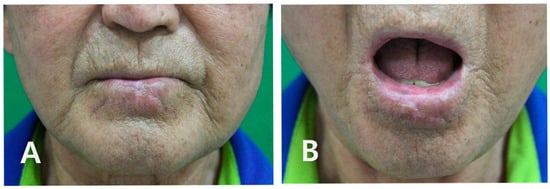 The postoperative course was uneventful. The flap remained entirely viable, and there were no wound complications such as hematoma, dehiscence, or infection. A full liquid diet was maintained for 2 days, followed by a soft diet from postoperative day 3, and sutures were removed on postoperative day 7. The patient was followed clinically every 3 months during the first year and every 6 months thereafter. At each visit, the lower lip and oral cavity were inspected, and the cervical lymph nodes were palpated; no suspicious nodal enlargement was detected. Additional imaging (contrast-enhanced CT) was performed at 3 months and showed no evidence of metastatic disease. There was no subsequent clinical suspicion of recurrence, so further imaging was not obtained. At the latest follow-up, 18 months after surgery, there was no evidence of local recurrence or regional metastasis, and the patient reported satisfactory oral competence without drooling, normal speech articulation, and acceptance of the cosmetic outcome (Figure 5A,B).