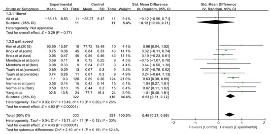Forest plot of gait speed. Studies included: Ali et al. [30], Kim et al. (2015) [40], Knox et al. [36], Mendoza et al. [43], Tsaih et al. [35], Van et al. [44], Verma et al. [37], Yang et al. [38].