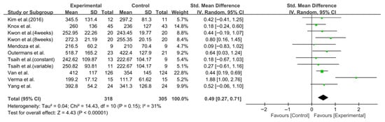 A forest plot of the Timed Up and Go test. Studies included: Ali et al. [30], Cha and Oh [32], Kim et al. (2016) [31], Knox et al. [36], Kuberan et al. [33], Kwon et al. [34], Malik et al. [39], Tsaih et al. [35], Van et al. [44], Yang et al. [38].