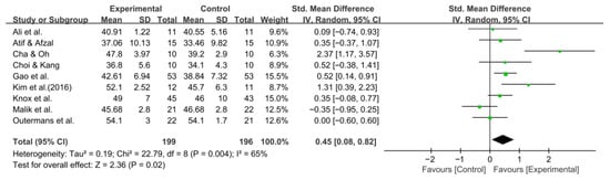 A forest plot of the Berg Balance Scale. Studies included: Ali et al. [30], Atif and Afzal [41], Cha and Oh [32], Choi and Kang [42], Gao et al. [29], Kim et al. (2016) [31], Knox et al. [36], Malik et al. [39], Outermans et al. [45].