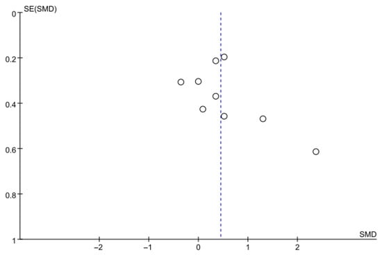 Balance was assessed using the BBS in nine studies comprising 395 participants. The homogeneity test indicated high heterogeneity (χ2 = 22.79, p = 0.004, I2 = 65%), warranting the use of a random-effects model to account for interstudy variability. Because heterogeneity remained moderate (I2 = 65%), subgroup analyses were performed, and detailed results are presented in Table 3. The meta-analysis showed a statistically significant improvement in the experimental group compared with the control group (Z = 2.36, p = 0.02; SMD: 0.45, 95% CI: 0.08, 0.82), reflecting a moderate effect size. Owing to the limited number of included studies, publication bias was not assessed, and no funnel plot analysis was performed. Figure 6 and Figure 7 show the forest and funnel plots.
