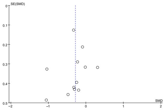 Balance was also evaluated using the TUG test in 10 studies comprising 642 participants. The homogeneity test indicated low heterogeneity (χ2 = 13.33, p = 0.27, I2 = 17%), warranting the use of a random-effects model to account for interstudy variability. The meta-analysis revealed a statistically significant reduction in the experimental group compared with the control group (Z = 2.92, p = 0.003; SMD: −0.28, 95% CI: −0.47, −0.09), indicating a small effect size. Egger’s regression test (t = −0.81, p = 0.44) and the Trim and Fill method identified no additional studies, suggesting no publication bias. Figure 8 and Figure 9 show the forest and funnel plots.