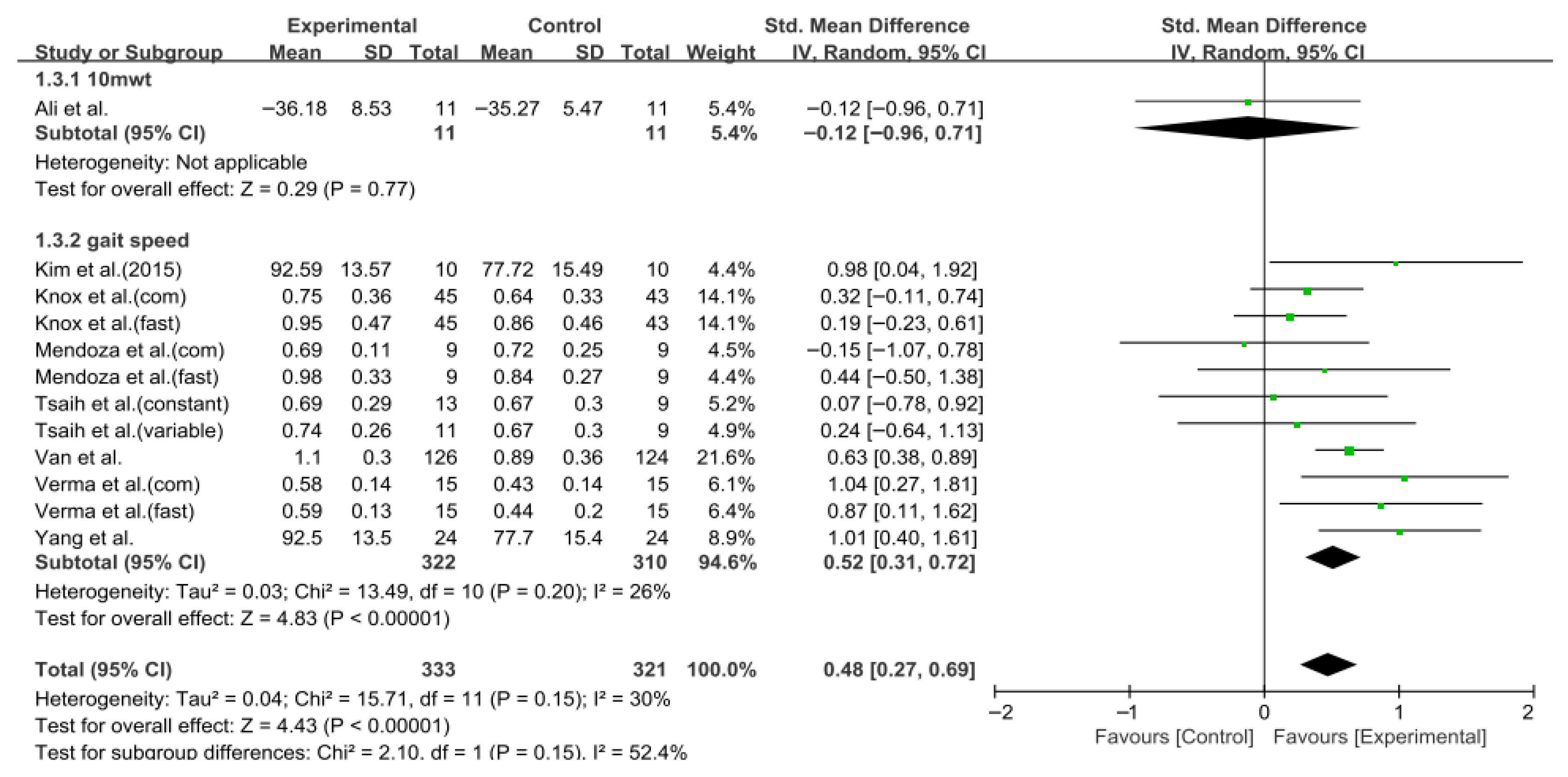 | Kwon et al. (2015) [34] | E: 50.7 ± 15.16 C: 47.15 ± 18.65 | E: 20 (14/6) C: 20 (12/8) | Chronic | E: task-oriented treadmill walking training C: conventional treadmill walking training | TUG, 6MWT |
