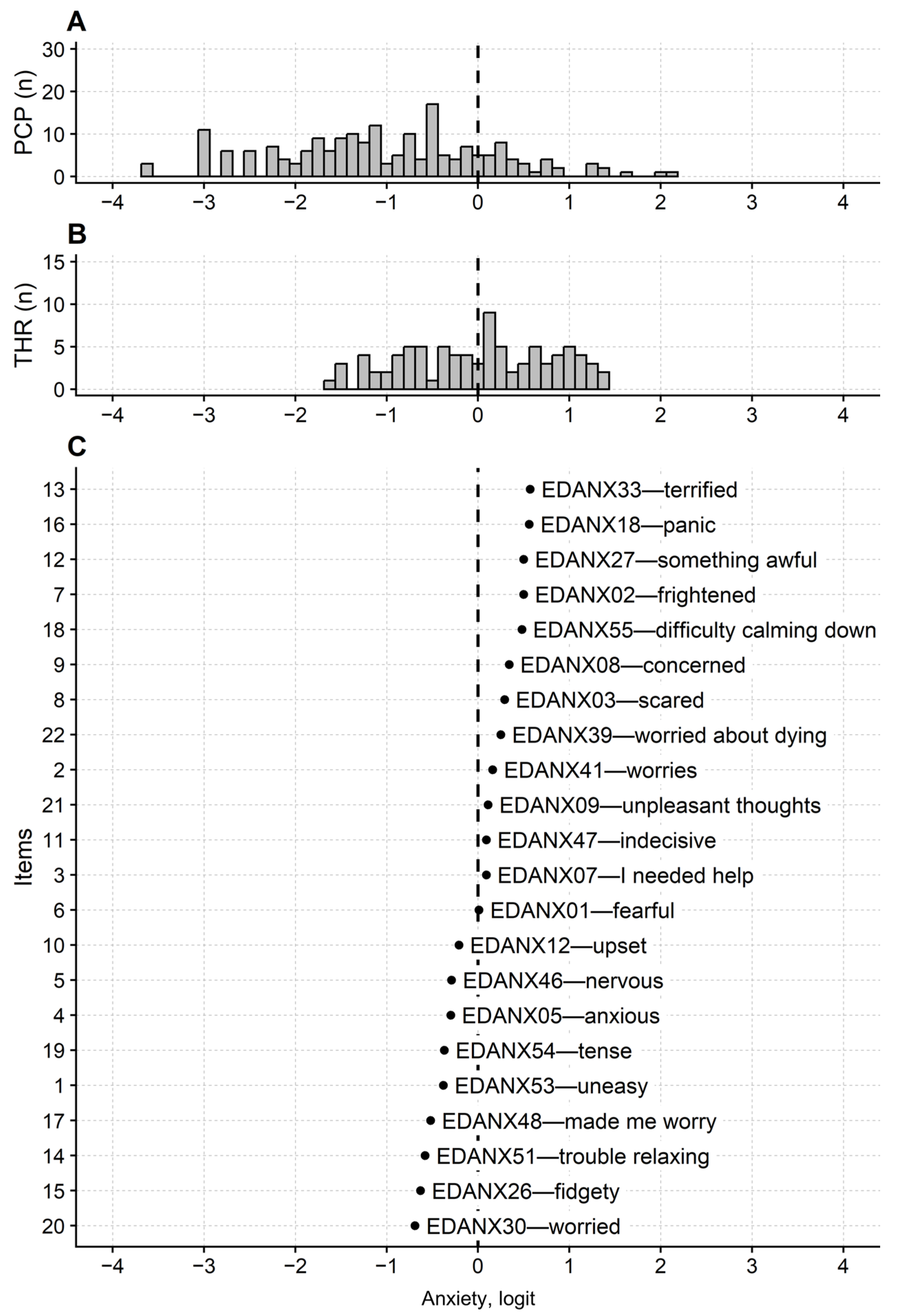 | (16) EDANX18 | I had sudden feelings of panic | 0.56 (0.09) | 0.95 (−0.35) | 0.73 (−1.40) |