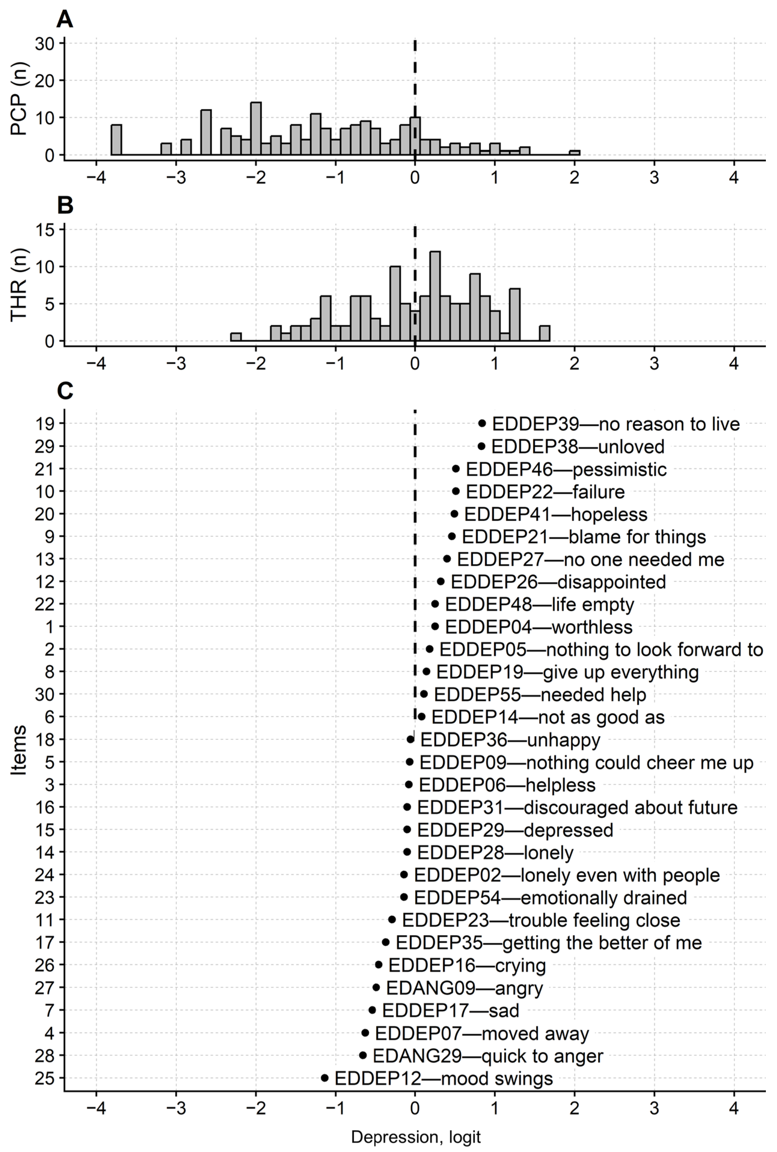 | (25) EDDEP12 | I had mood swings | −1.14 (0.08) | 1.30 (2.65) | 1.43 (2.97) |