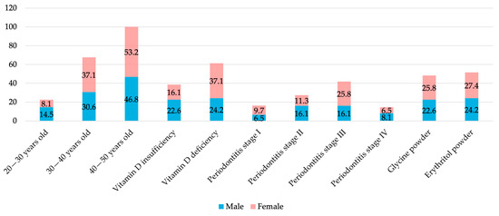 The study included a total of 62 patients (29 males and 33 females), with ages ranging from 22 to 50 and an average age of 42.6 years. The mean serum 25(OH)D3 concentration was 18.56 ng/mL, with 38 patients (61.3%), including 23 females (69.7%), diagnosed with vitamin D3 deficiency (<20 ng/mL). Regarding periodontal status, most patients were diagnosed with stage III periodontitis, of whom 25.8% were females. As for the periodontal therapy, 30 patients received additional subgingival air-polishing with glycine powder, while 32 were treated with erythritol powder (Table 1, Figure 2).