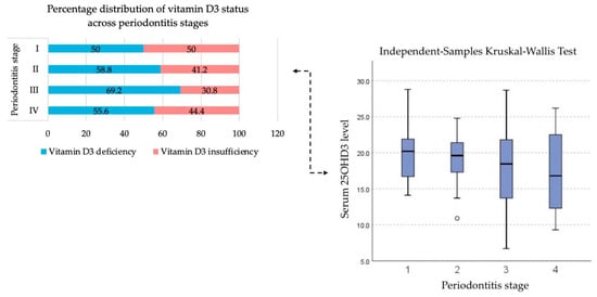 Contrary to our findings, studies published in 2022 and 2024 found that the stage of periodontitis (I–IV) was significantly negatively correlated with the serum level of vitamin D3. The vitamin D3 level decreased with the progression of the disease to a higher stage [32,33].