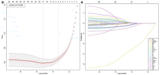LASSO-logistic regression results. (A) Cross-validation plot. (B) Selection process by cross-validation method. BMI, body mass index; SBP, systolic blood pressure; DBP, diastolic blood pressure; Hb, hemoglobin; WBC, white blood cells; NEU, neutrophils; NEU%, neutrophil percentage; LYMPHO%, lymphocytes percentage; CRP, C-reactive protein; TC, total cholesterol; TG, triglycerides; LDH, lactate dehydrogenase; CK, creatine kinase; CK-MB, creatine kinase-MB isoenzyme; NT-proBNP, N-terminal pro-brain natriuretic peptide; AST, aspartate aminotransferase; ALT, alanine aminotransferase; FDP, fibrin degradation products; LVEF, left ventricular ejection fraction; CAG, coronary angiography.