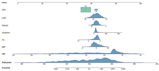 Nomogram to predict the probability of in-hospital CS for AMI patients. SBP, systolic blood pressure; DBP, diastolic blood pressure; TG, triglycerides; LVEF, left ventricular ejection fraction; CAG, coronary angiography.