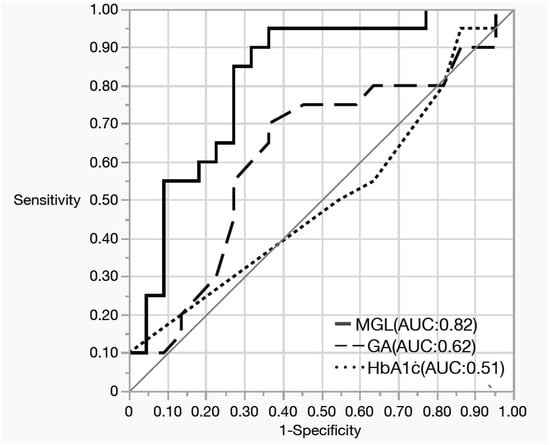 Receiver operating characteristic (ROC) curves for predicting maternal adverse events using mean glucose level (MGL), glycated hemoglobin (HbA1c), and glycated albumin. MGL showed the highest area under the curve (AUC), indicating superior predictive performance for maternal adverse events compared with HbA1c and glycated albumin.