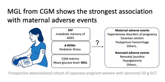 APA StyleKakuto, Y., Ohara, M., Koide, K., Osamura, A., Matsuura, R., Yamagishi, S.-i., & Sekizawa, A. (2025). Skin Autofluorescence and Perinatal Outcomes in Pregnant Women with a Positive Glucose Challenge Test: A Prospective Study with Exploratory Analyses of Oxidative Stress and CGM Metrics. Journal of Clinical Medicine, 14(24), 8796. https://doi.org/10.3390/jcm14248796