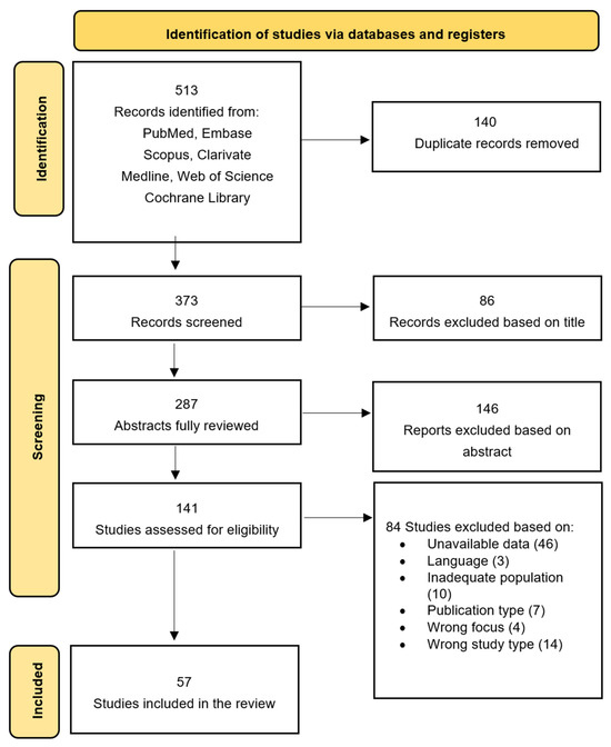 The database search identified 513 records. After removing 140 duplicates, 373 records were screened by title and abstract, and 287 full-text articles were assessed for eligibility. A total of 57 studies met the inclusion criteria and were included in the systematic review and meta-analysis (Figure 1, PRISMA 2020 flow diagram).