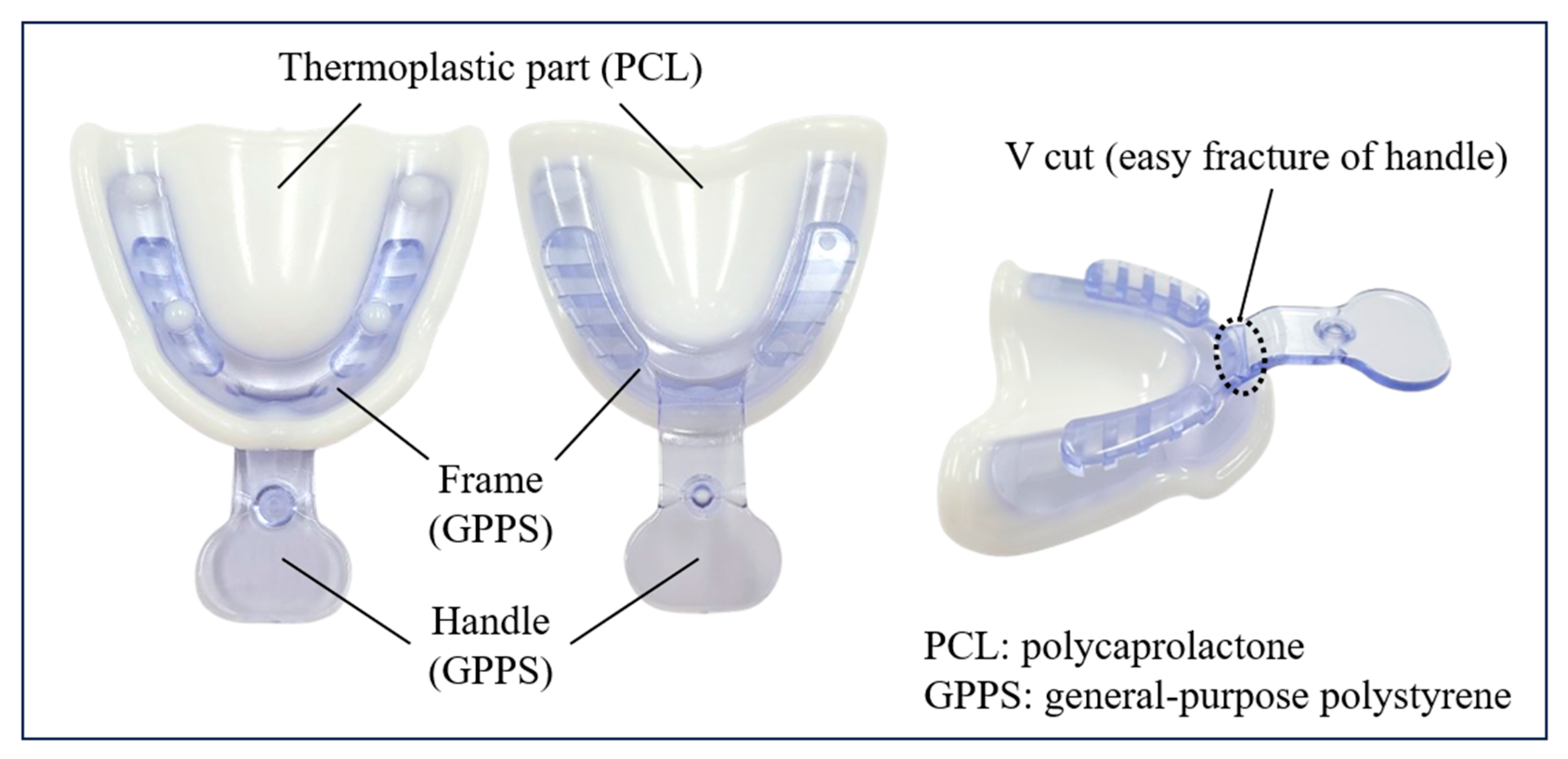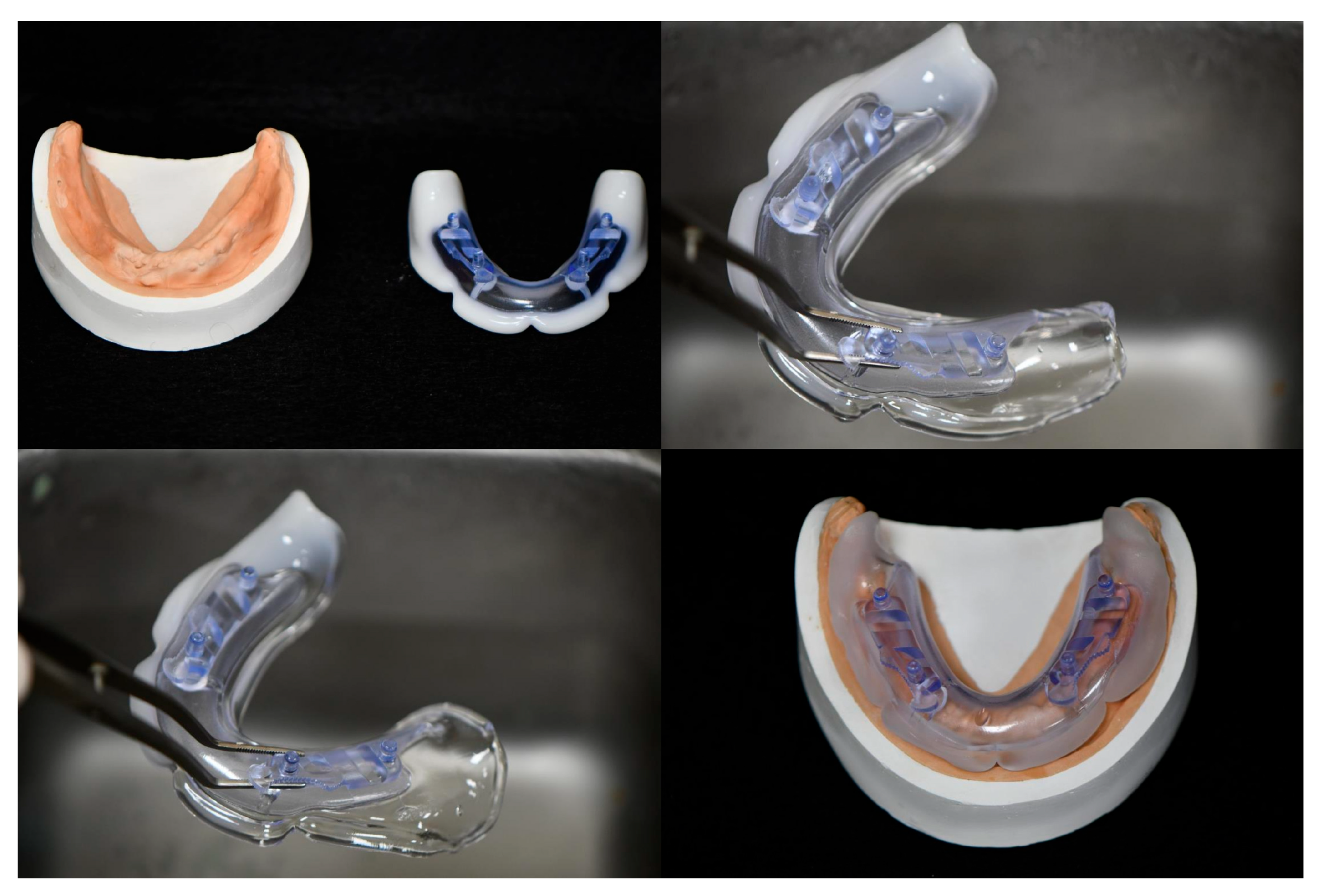 - Chaffee, N.R.; Cooper, L.F.; Felton, D.A. A technique for border molding edentulous impressions using vinyl polysiloxane material. J. Prosthodont. 1999, 8, 129–134. [Google Scholar] [CrossRef] [PubMed]