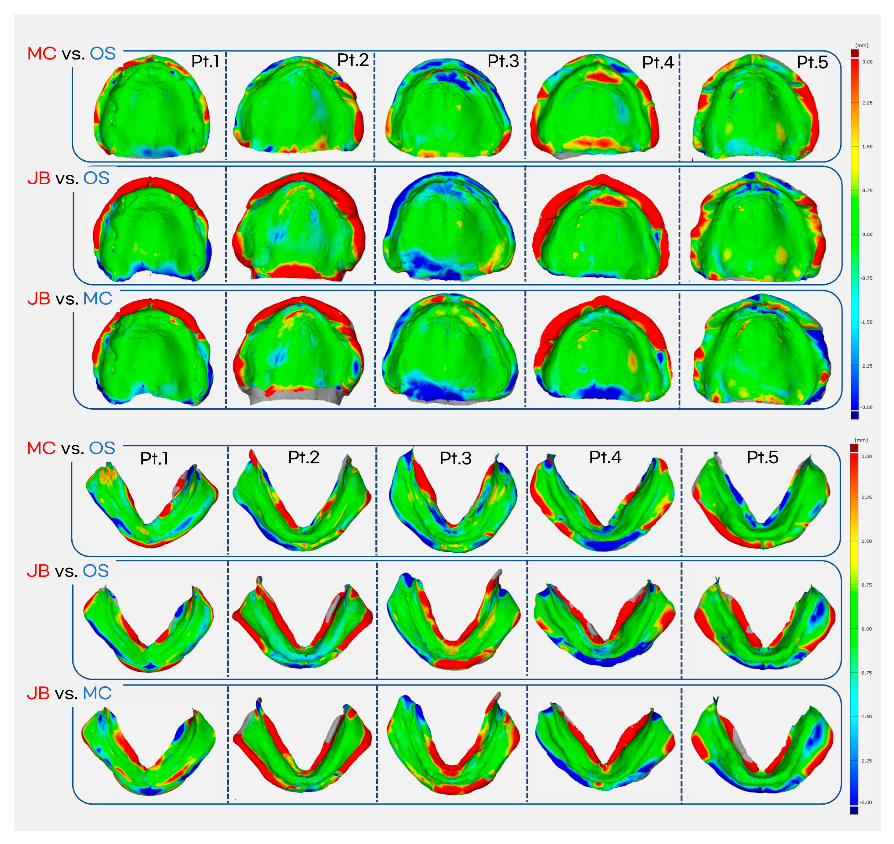 - Cameron, A.B.; Abuzar, M.A.; Tadakamadla, S.K.; Evans, J.L. Assessment of clinical reproducibility for intraoral scanning on different anatomical regions for the complete maxillary edentulous arch with two intraoral scanners. J. Dent. 2025, 153, 105485. [Google Scholar] [CrossRef]