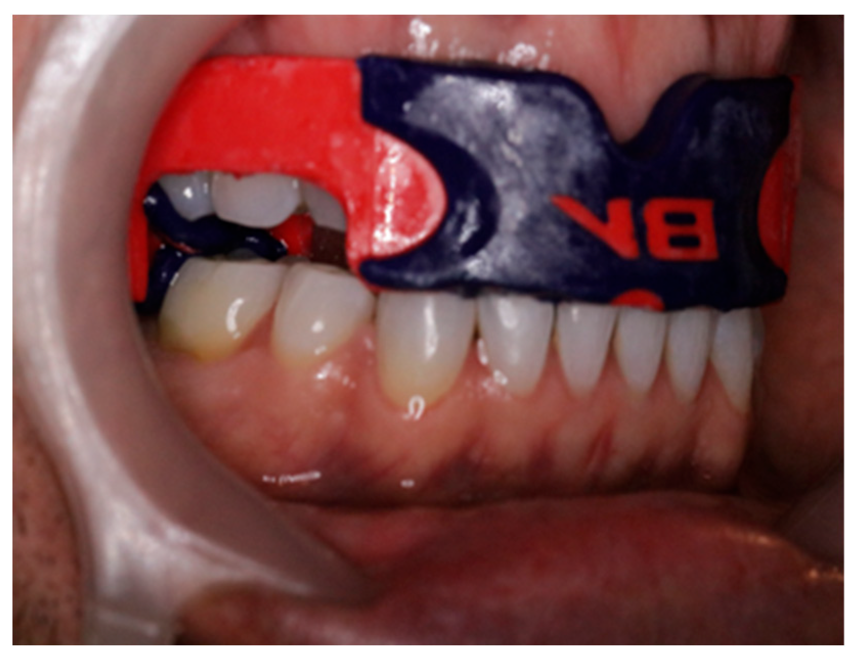 - Sliwkanich, L.; Ouanounou, A. Mouthguards in dentistry: Current recommendations for dentists. Dent. Traumatol. 2021, 37, 661–671. [Google Scholar] [CrossRef]
