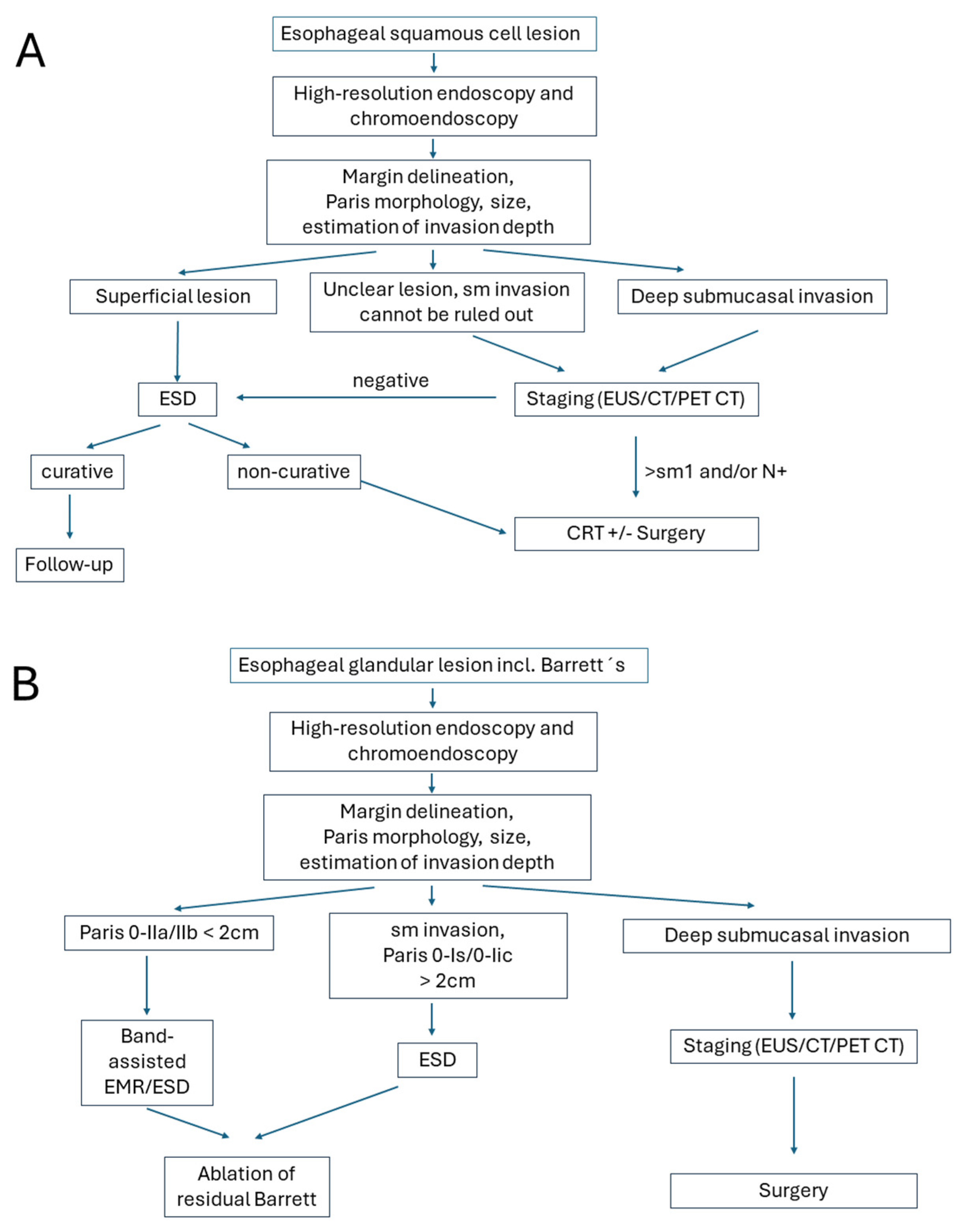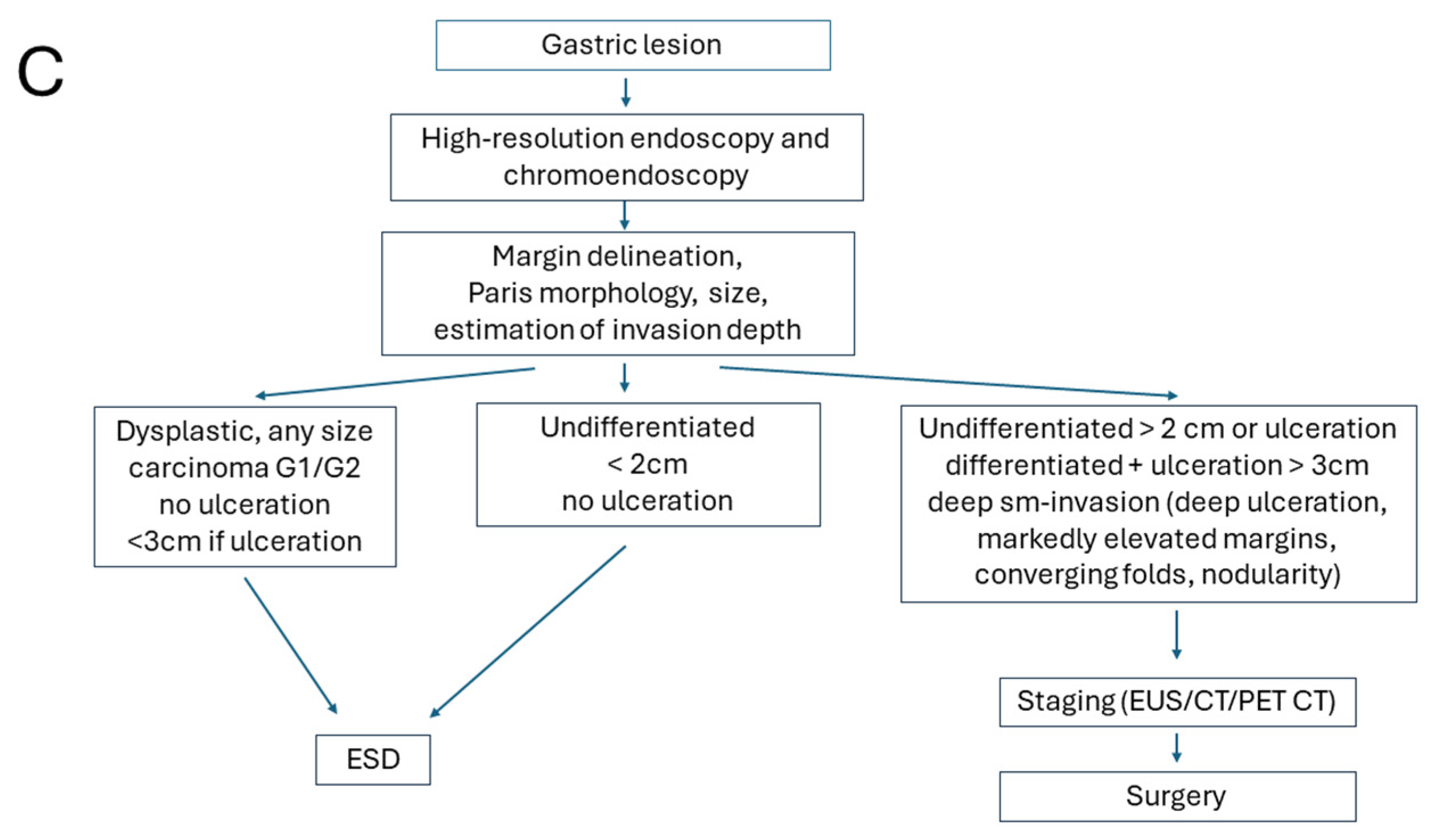 The location of the lesion may also contribute to therapeutic decision-making: ideal for ESD are better accessible and technically favorable areas such as the gastric antrum, mid/distal esophagus, or lesser curvature of the stomach. These sites facilitate easier scope maneuverability, En bloc resection, and lower complication rates. In contrast, the gastric cardia, fundus, greater curvature, upper/middle esophagus, or near anatomic bends and previous surgical sites are anatomically challenging regions posing significant technical difficulties for ESD. These locations increase the risk of incomplete resection, perforation, and procedural failure. In such cases, surgery may be preferred, especially if expertise or specialized equipment is limited. Algorithms for clinical decision-making are presented in