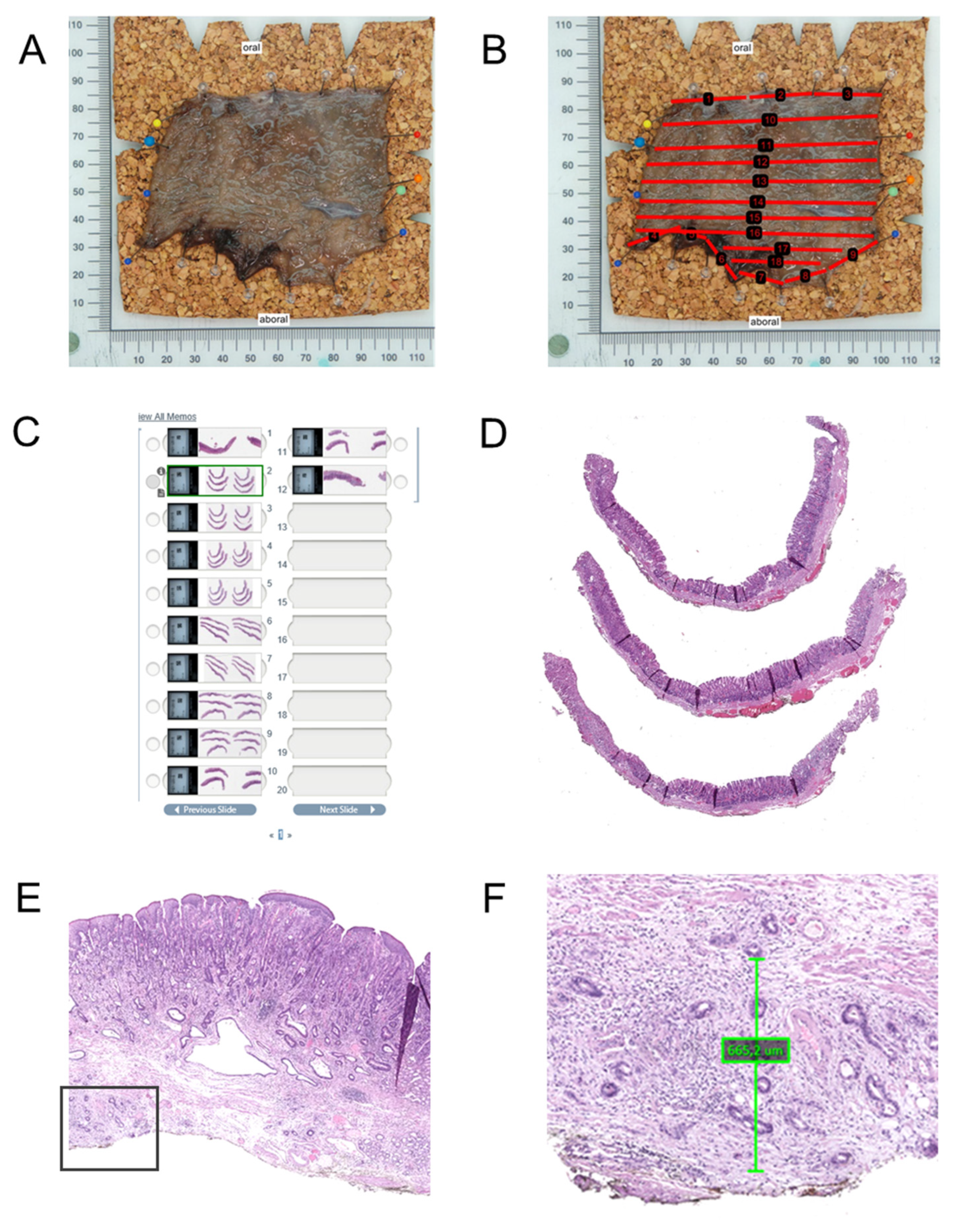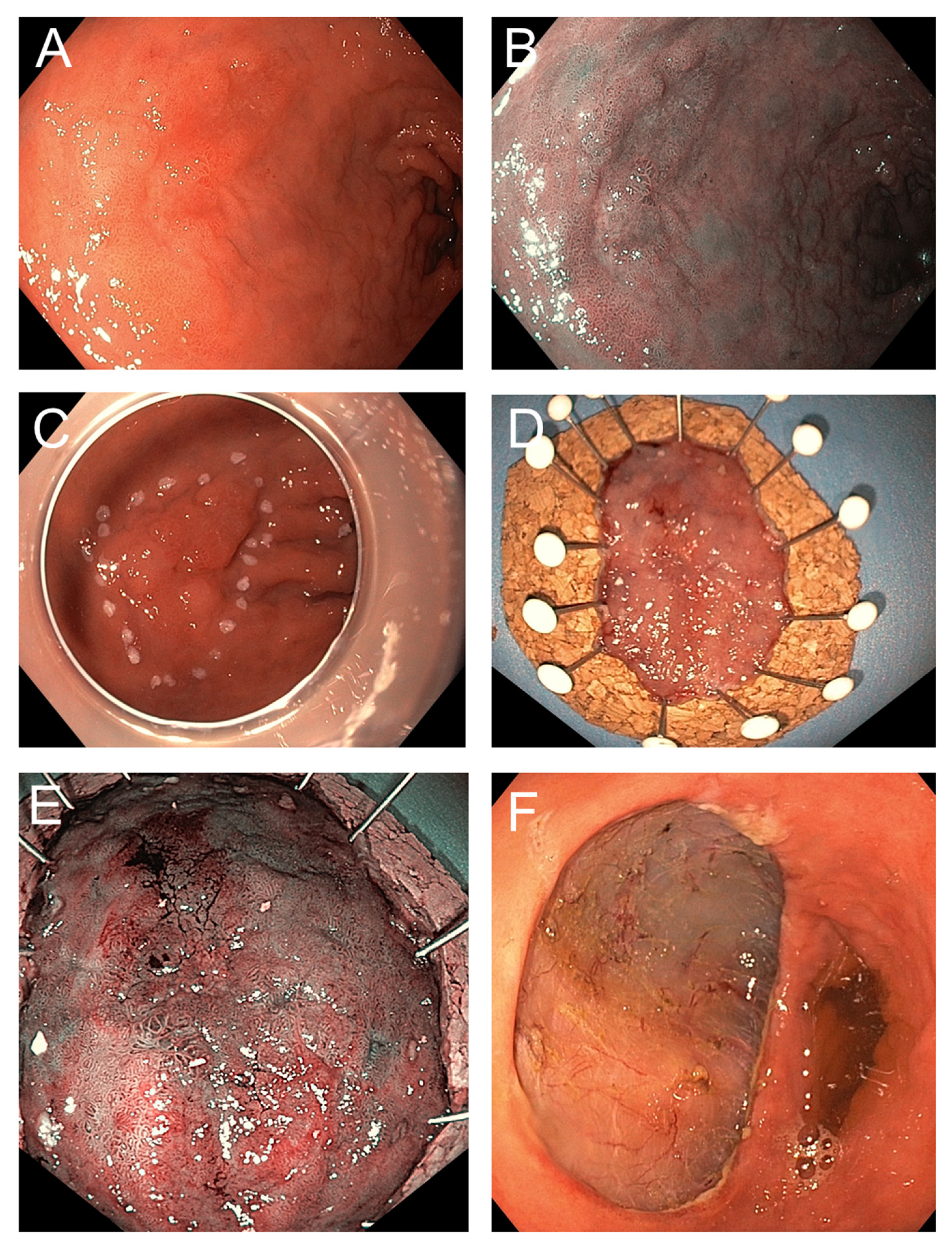 Figure 2D,E). Ideally the specimen should be pinned, mucosal side up, on a flat board usually made of cork, Styrofoam, or silicone. This step preserves the anatomical orientation, prevents curling, and allows for reproducible spatial correlation between endoscopic and histological findings. Specimen shrinkage can make margin assessment difficult if not stretched properly before fixation. After pinning, the specimen is immersed in 10% neutral-buffered formalin, typically for a duration of 24 to 48 h. A fixative volume of at least 10 times the specimen volume is recommended. Fixation delay or uneven penetration can result in artifacts such as epithelial detachment, obscuring diagnostic features [