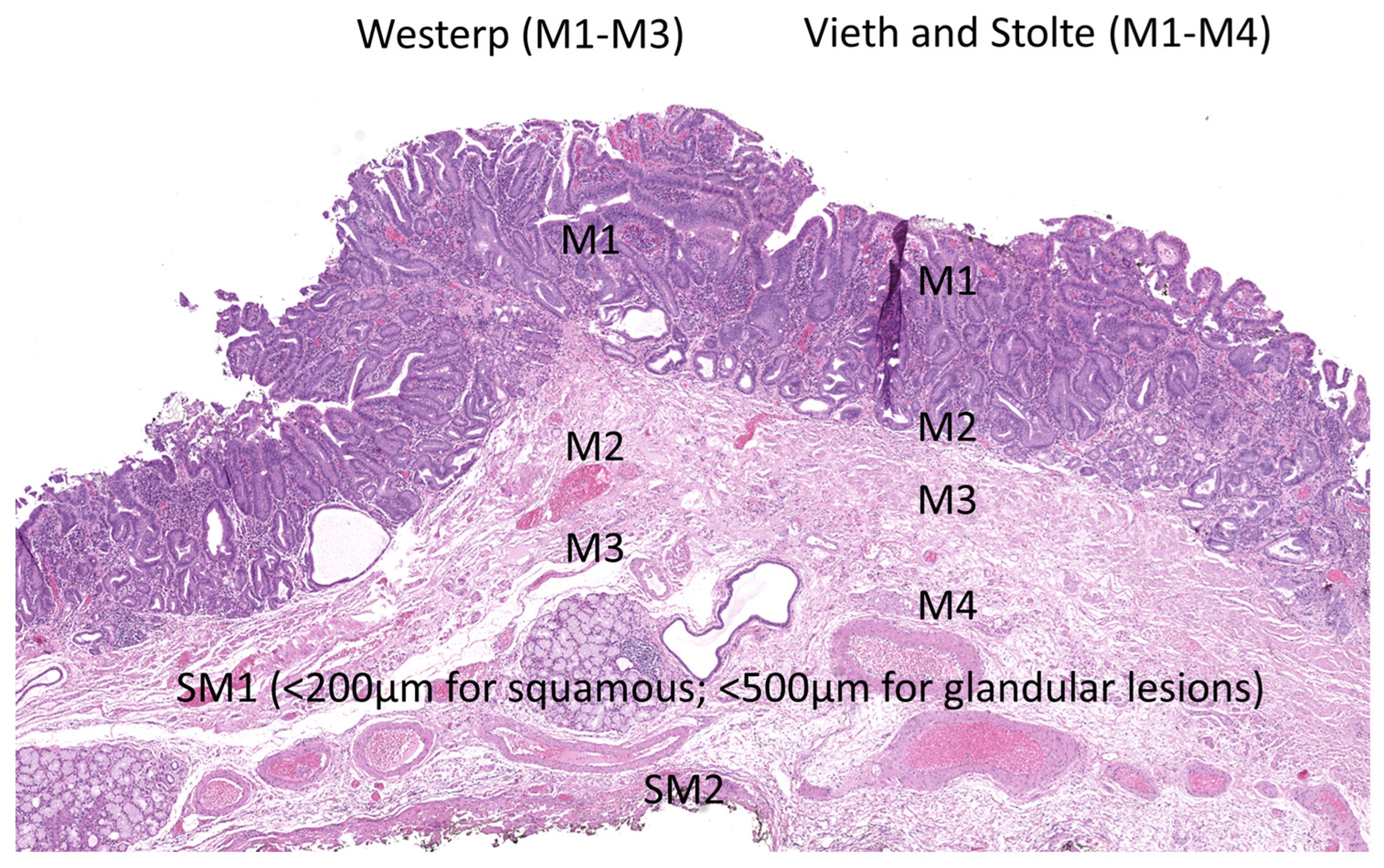 Early gastroesophageal carcinomas, including superficial esophageal squamous cell carcinomas (ESCCs), esophageal adenocarcinomas (EACs), adenocarcinomas of the gastroesophageal junction (GEJ), and gastric cancers (GCs), are intramucosal carcinomas or superficially invasive carcinomas without or with only minor risk for lymph node metastases [