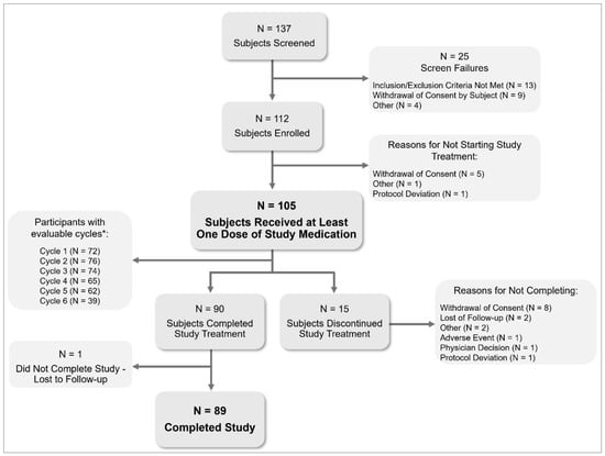 Subject disposition in a six-month paediatric study with estetrol/drospirenone (N = 105). * Evaluable cycles: cycles with a length of 22–35 days or with ≥2 hormone-free days at the end of the cycle. Subjects can have multiple reasons for screen failure.