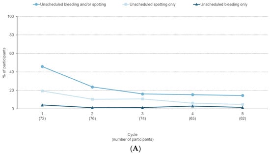 The proportion of participants reporting unscheduled bleeding and/or spotting decreased from 45.8% in Cycle 1 to 14.5% in Cycle 5 (Figure 2A). In participants reporting unscheduled bleeding and/or spotting, the median duration decreased from nine days in Cycle 1 to six days in Cycle 5. The proportion of participants reporting scheduled bleeding and/or spotting varied between 77.4% and 90.5% (Figure 2B). In participants reporting scheduled bleeding and/or spotting, the median duration decreased from six days in Cycle 1 to four days in Cycle 5. Absence of scheduled bleeding increased from 9.5% (Cycle 3) to 22.6% (Cycle 5) (Figure 2B).