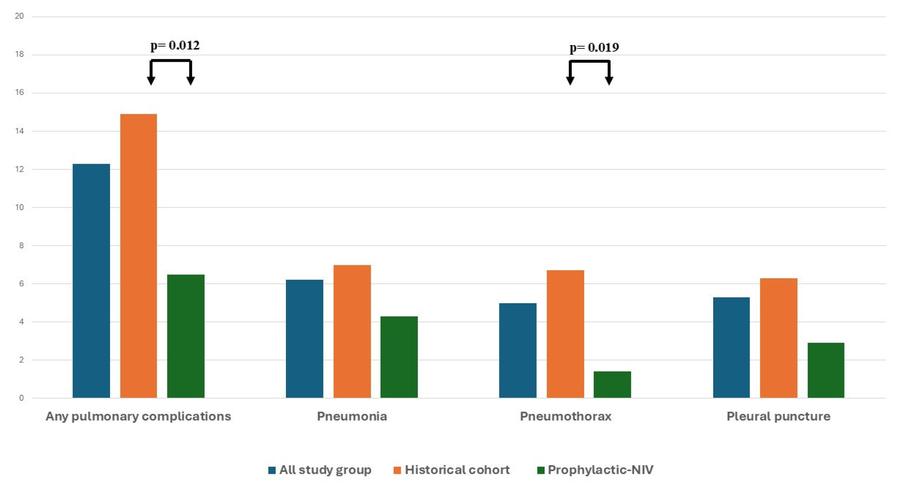 Postoperative pulmonary complications were observed in 14.9% of the historical control cohort versus 6.5% of the prophylactic NIV cohort (