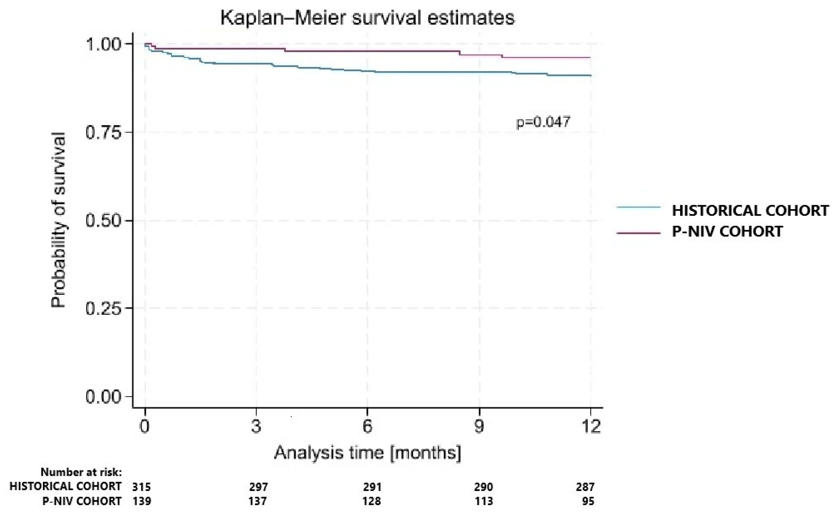 p = 0.021). Although early postoperative mortality did not differ significantly, Kaplan–Meier analysis demonstrated superior one-year survival in the P-NIV group compared with the historical cohort (log-rank