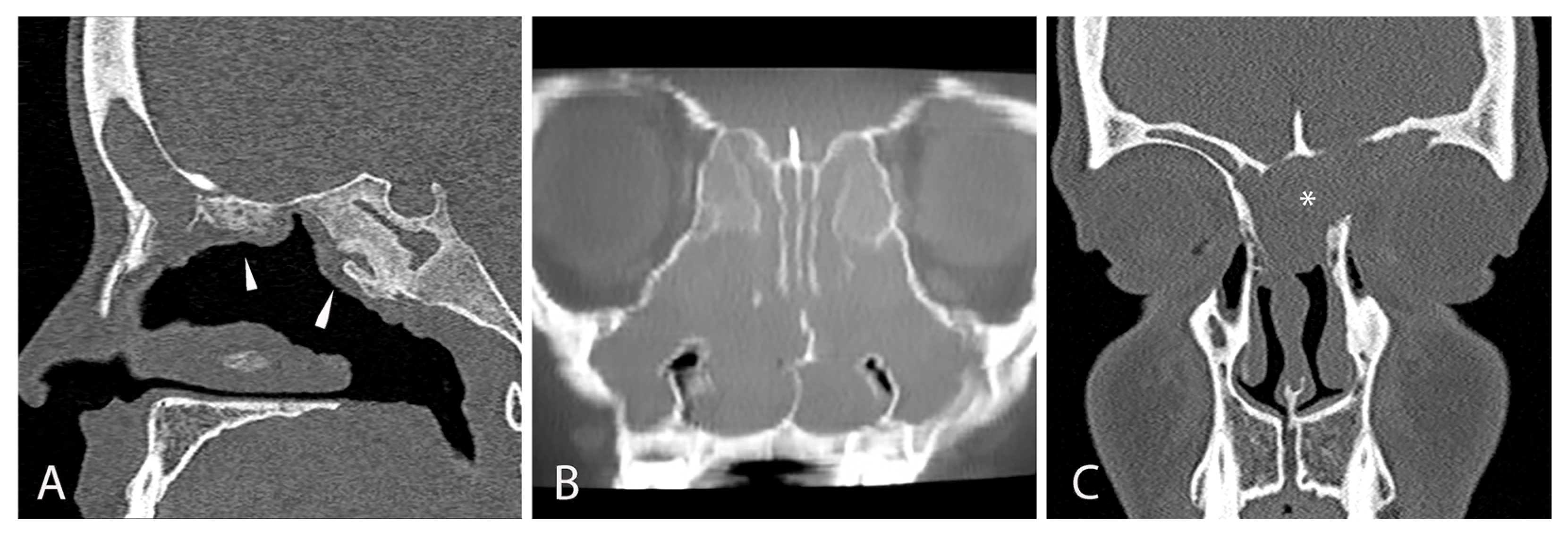 - Baban, M.I.A.; Hadi, M.; Gallo, S.; Zocchi, J.; Turri-Zanoni, M.; Castelnuovo, P. Radiological and clinical interpretation of the patients with CSF leaks developed during or after endoscopic sinus surgery. Eur. Arch. Otorhinolaryngol. 2017, 274, 2827–2835. [Google Scholar] [CrossRef]