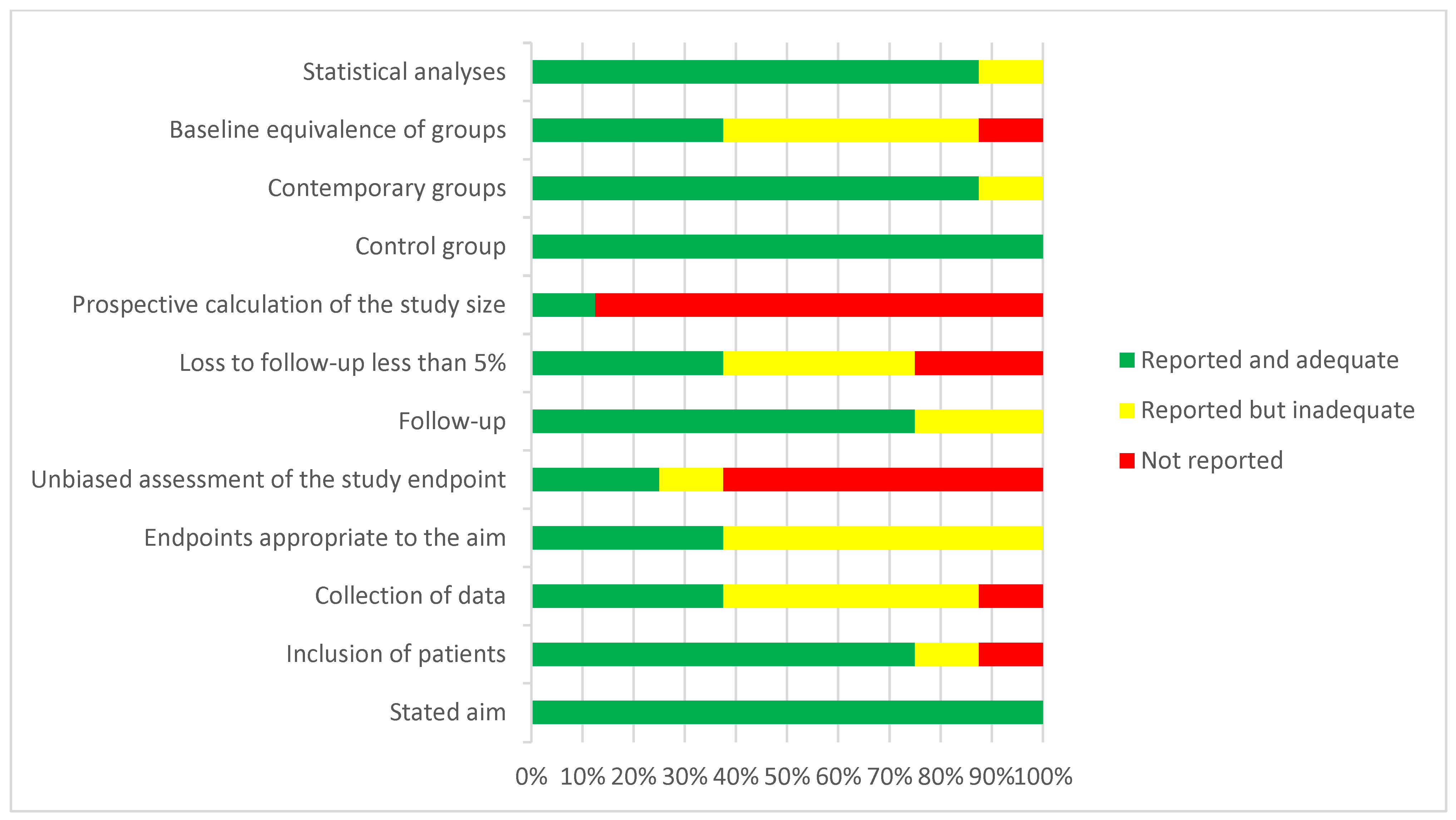 | Study | Stated Aim | Inclusion of Patients | Collection of Data | Endpoints Appropriate to the Aim | Unbiased Assessment of the Study Endpoint | Follow-Up | Loss to Follow-Up Less Than 5% | Prospective Calculation of the Study Size | Control Group | Contemporary Groups | Baseline Equivalent of Groups | Statistical Analyses | Total |