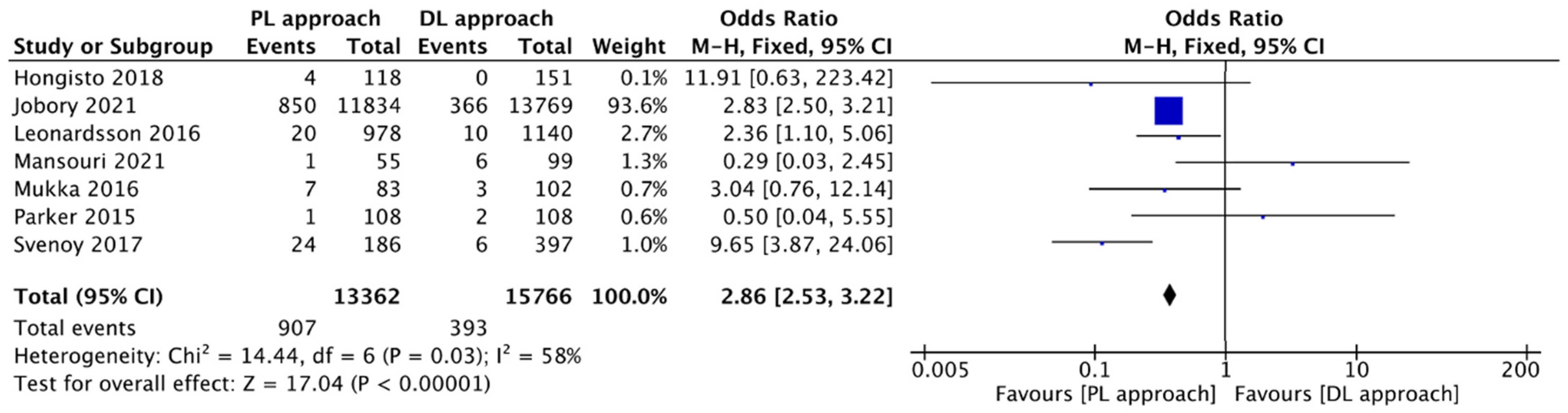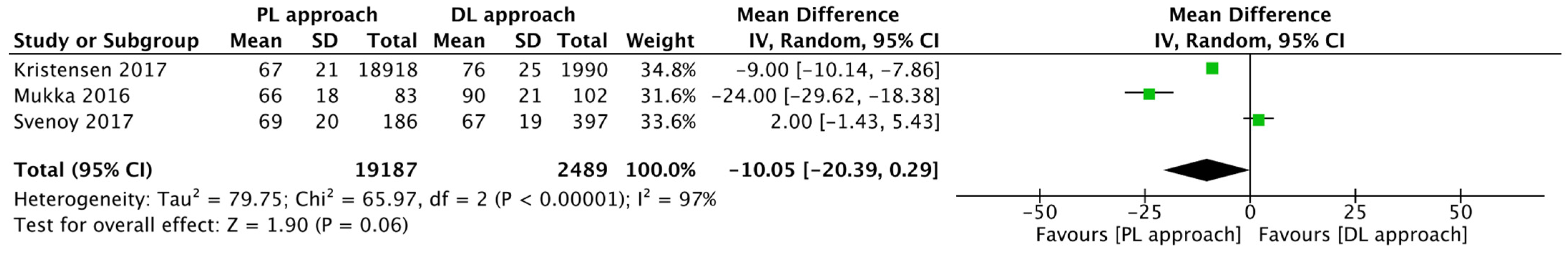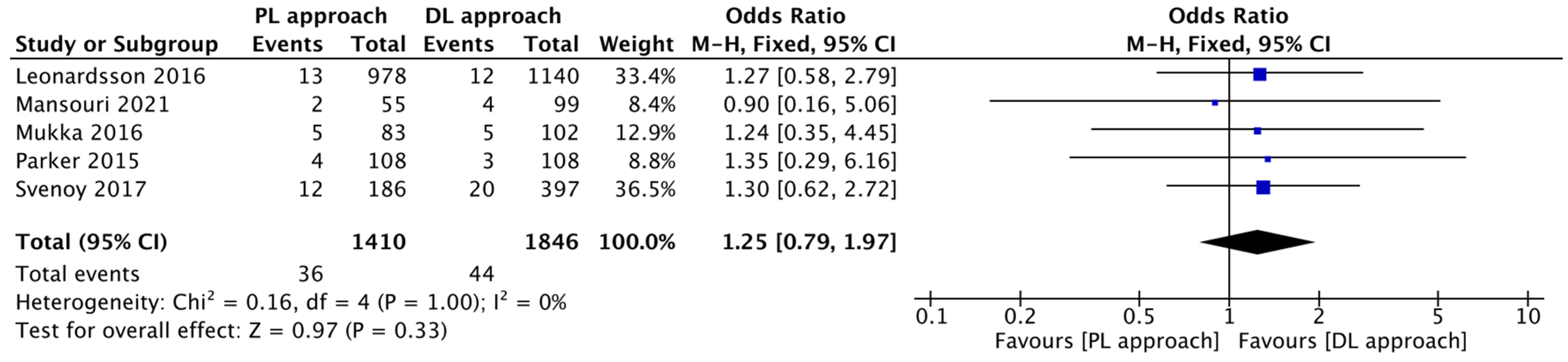 | Svenoy et al., 2017 [16] | PS | PL DL | 186 397 | 12 | 82.8 | 74 | No significant differences in patient demographics. Source of patients (hospital) and surgical volume differed. | No. Outcome assessment (complication) based on chart review (unblinded). | High risk of Selection/Performance Bias. PL group from one hospital, DL group from three different hospitals. |