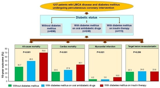 - Lee, K.; Ahn, J.M.; Yoon, Y.H.; Kang, D.Y.; Park, S.Y.; Ko, E.; Park, H.; Cho, S.C.; Park, S.; Kim, T.O.; et al. Long-Term (10-Year) Outcomes of Stenting or Bypass Surgery for Left Main Coronary Artery Disease in Patients With and Without Diabetes Mellitus. J. Am. Heart Assoc. 2020, 9, e015372. [Google Scholar] [CrossRef]