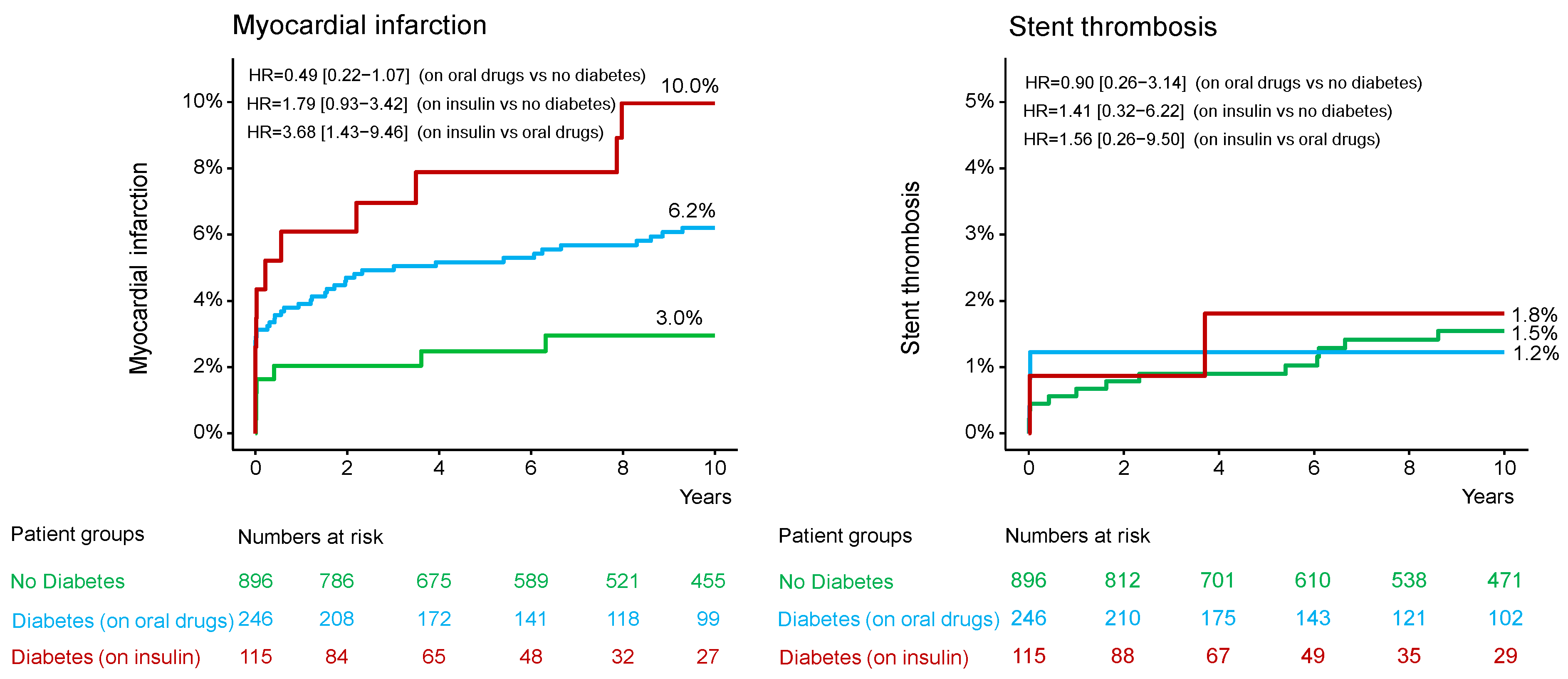 | Myocardial infarction | 54 (6.2) | 7 (3.0) | 11 (10.0) | 0.49 [0.22–1.07] | 1.79 [0.93–3.42] | 3.68 [1.43–9.46] |