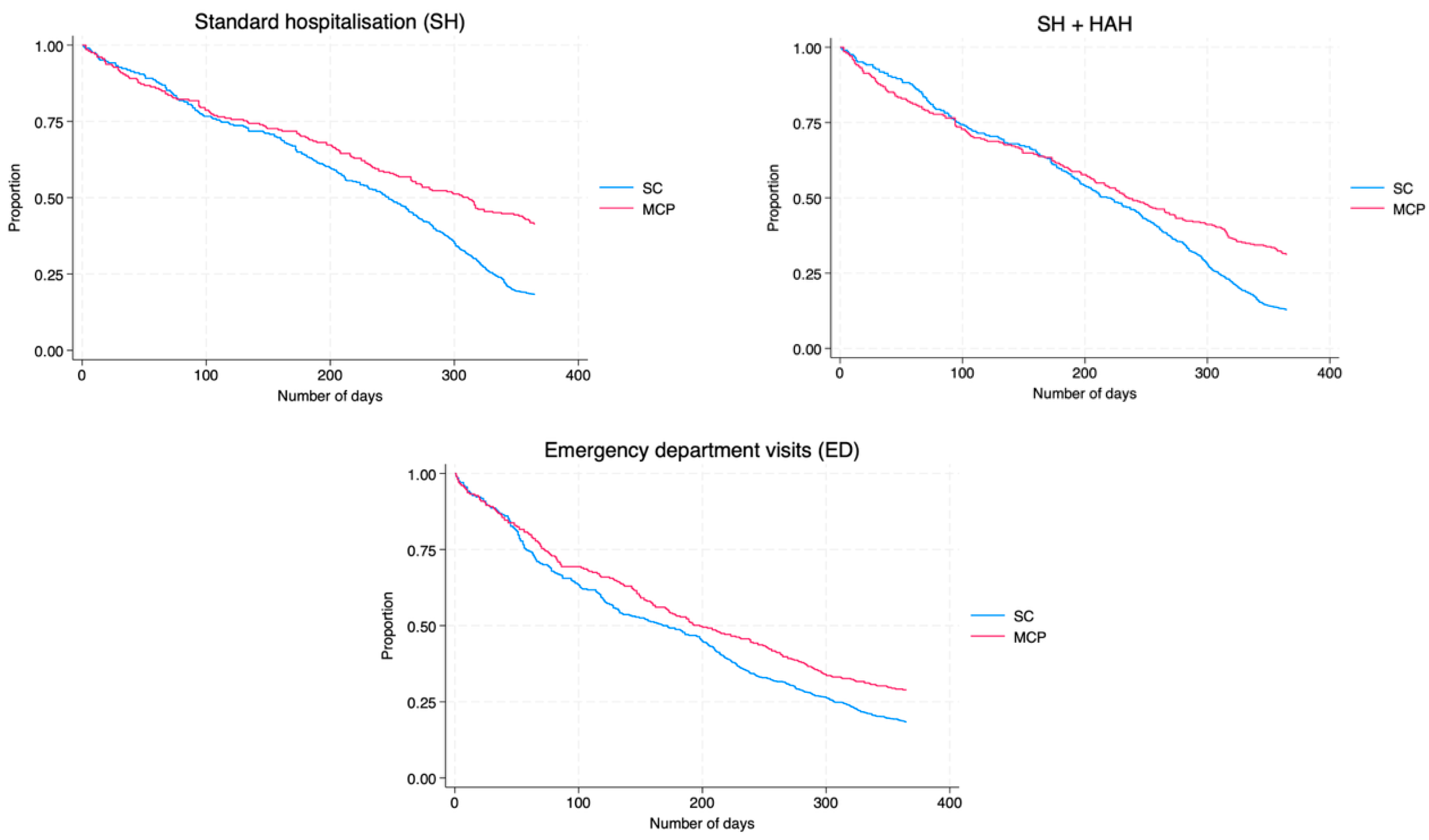 | Hospital-at-home care (HAH) | 0.84 (0.51–1.36) |