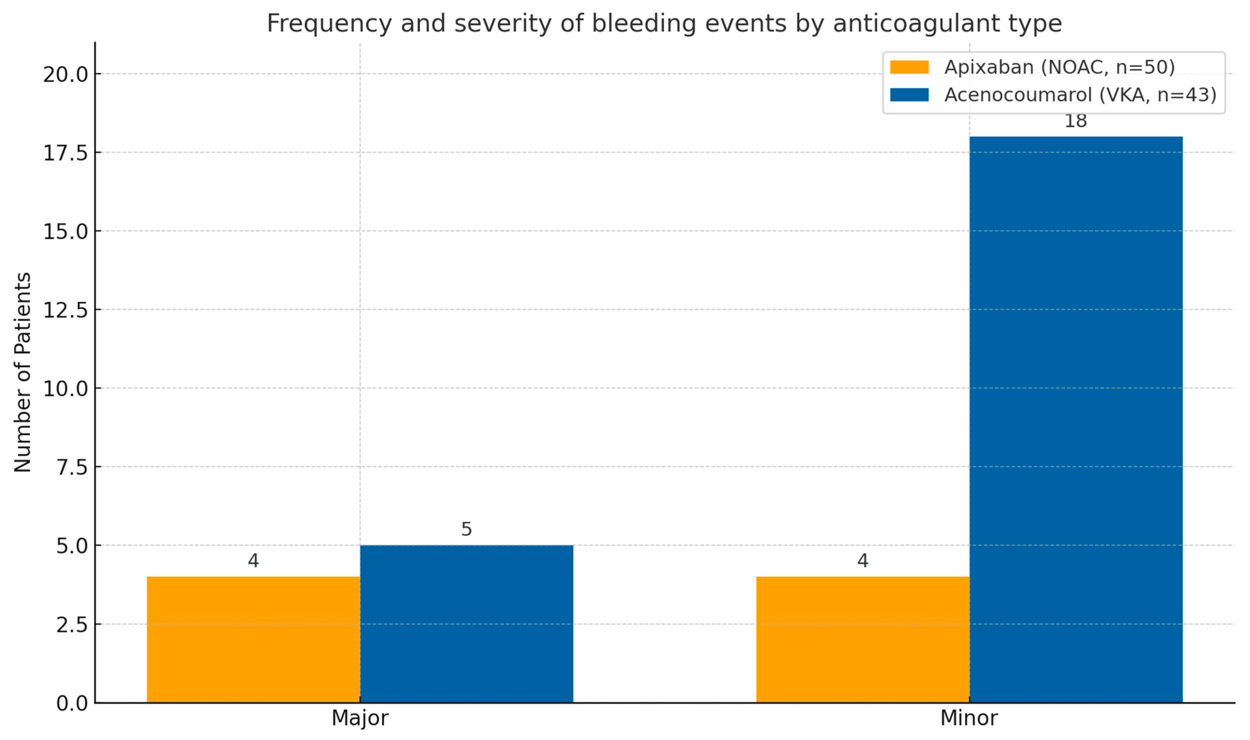 | Event Type | Apixaban (n = 50) | Acenocoumarol (n = 43) | p |