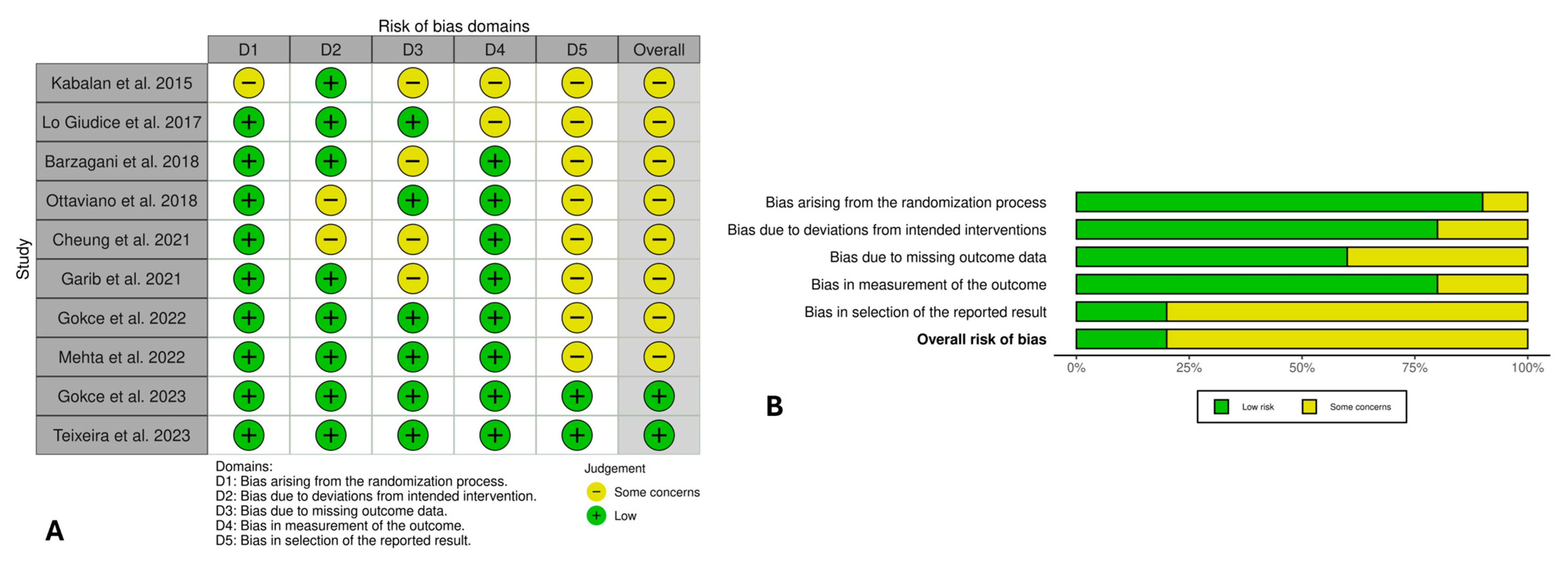 - Sterne, J.A.C.; Savović, J.; Page, M.J.; Elbers, R.G.; Blencowe, N.S.; Boutron, I.; Cates, C.J.; Cheng, H.-Y.; Corbett, M.S.; Eldridge, S.M.; et al. RoB 2: A Revised Tool for Assessing Risk of Bias in Randomised Trials. BMJ 2019, 366, l4898. [Google Scholar] [CrossRef] [PubMed]