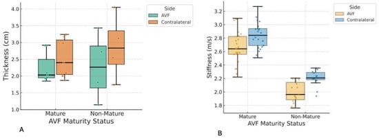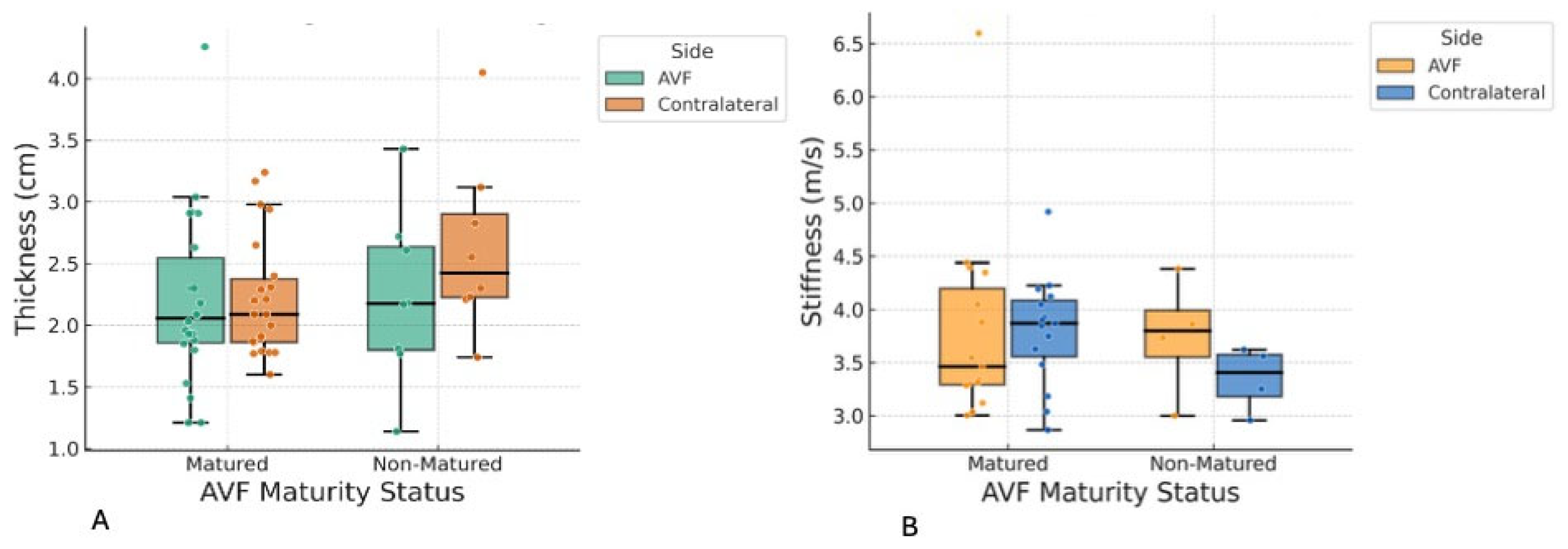 These figures showed the Brachioradialis muscle thickness and stiffness in arteriovenous fistula (AVF) and contralateral arms, stratified by AVF maturity. Box-and-whisker plots showing (A) muscle thickness (cm) and (B) shear wave velocity (m/s) of the brachioradialis in matured and non-matured AVFs compared with the contralateral arm. Each dot represents an individual measurement; boxes indicate the interquartile range, horizontal lines represent median values, and whiskers denote the data range excluding outliers.