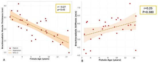 These figures showed the correlation of brachioradialis muscle thickness and stiffness with fistula age. Scatter plots with linear regression lines and 95% confidence intervals (shaded areas) showing the relationship between fistula age (years) and (A) muscle thickness (cm) and (B) shear wave velocity (m/s). Pearson correlation coefficients (r) and p-values are displayed on each plot.