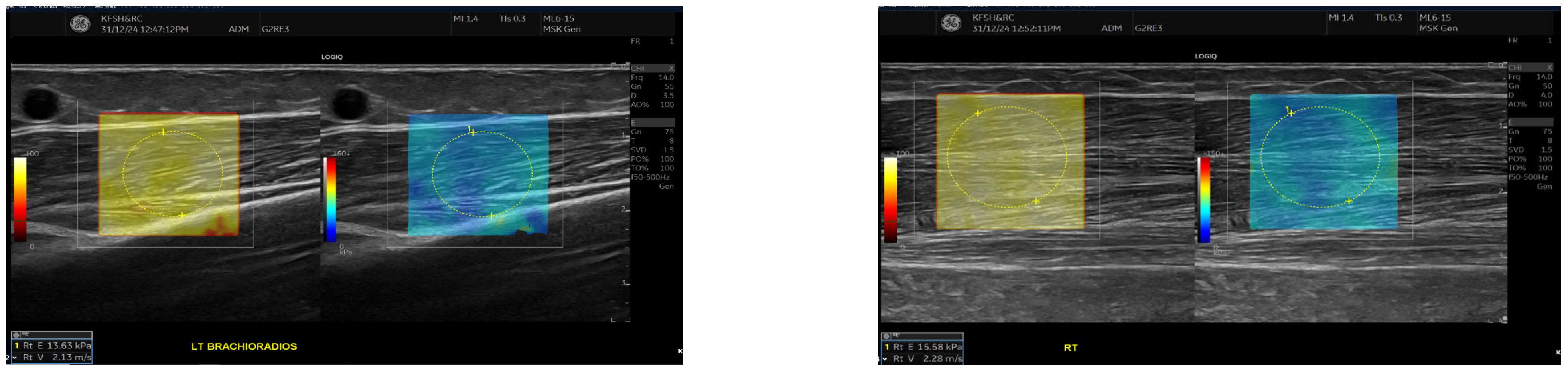 - Roots, J.; Trajano, G.S.; Bretherton, A.; Drovandi, C.; Fontanarosa, D. Difference in stiffness between biceps brachii muscle bellies using shear wave elastography. Appl. Sci. 2024, 14, 3456. [Google Scholar] [CrossRef]