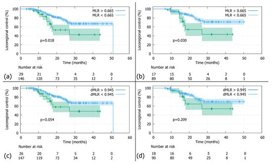 Locoregional control (LRC): (a) In the whole cohort stratified by the MLR threshold (0.665), patients with MLRs above the cutoff had significantly worse LRCs than those below (N = 175; log-rank p-value 0.018). (b) In the Durvalumab subgroup stratified by the MLR threshold (0.665), patients with MLRs above the cutoff had significantly worse LRCs than those below (N = 106; log-rank p-value 0.030). (c) In the whole cohort stratified by the dMLR threshold (0.945), patients with dMLRs above the cutoff showed a tendency towards inferior LRCs, which did not reach statistical significance (N = 173; log-rank p-value 0.054). (d) In the Durvalumab subgroup stratified by the dMLR threshold (0.945), patients with dMLRs above the cutoff had nominally inferior LRCs, which did not reach statistical significance (N = 108; log-rank p-value = 0.209).