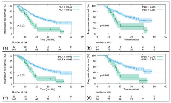 Progression-free survival (PFS): (a) In the whole cohort stratified by the MLR threshold (0.665), patients with MLRs above the cutoff had significantly worse PFS than those below (N = 175; log-rank p-value < 0.001). (b) In the Durvalumab subgroup stratified by the MLR threshold (0.665), patients with MLRs above the cutoff had significantly worse PFS than those below (N = 106; log-rank p-value < 0.001). (c) In the whole cohort stratified by the dMLR threshold (0.945), patients with dMLRs above the cutoff had significantly worse PFS than those below (N = 173; log-rank p-value < 0.001). (d) In the Durvalumab subgroup stratified by the dMLR threshold (0.945), patients with dMLRs above the cutoff had significantly worse PFS than those below (N = 108; log-rank p-value = 0.003).