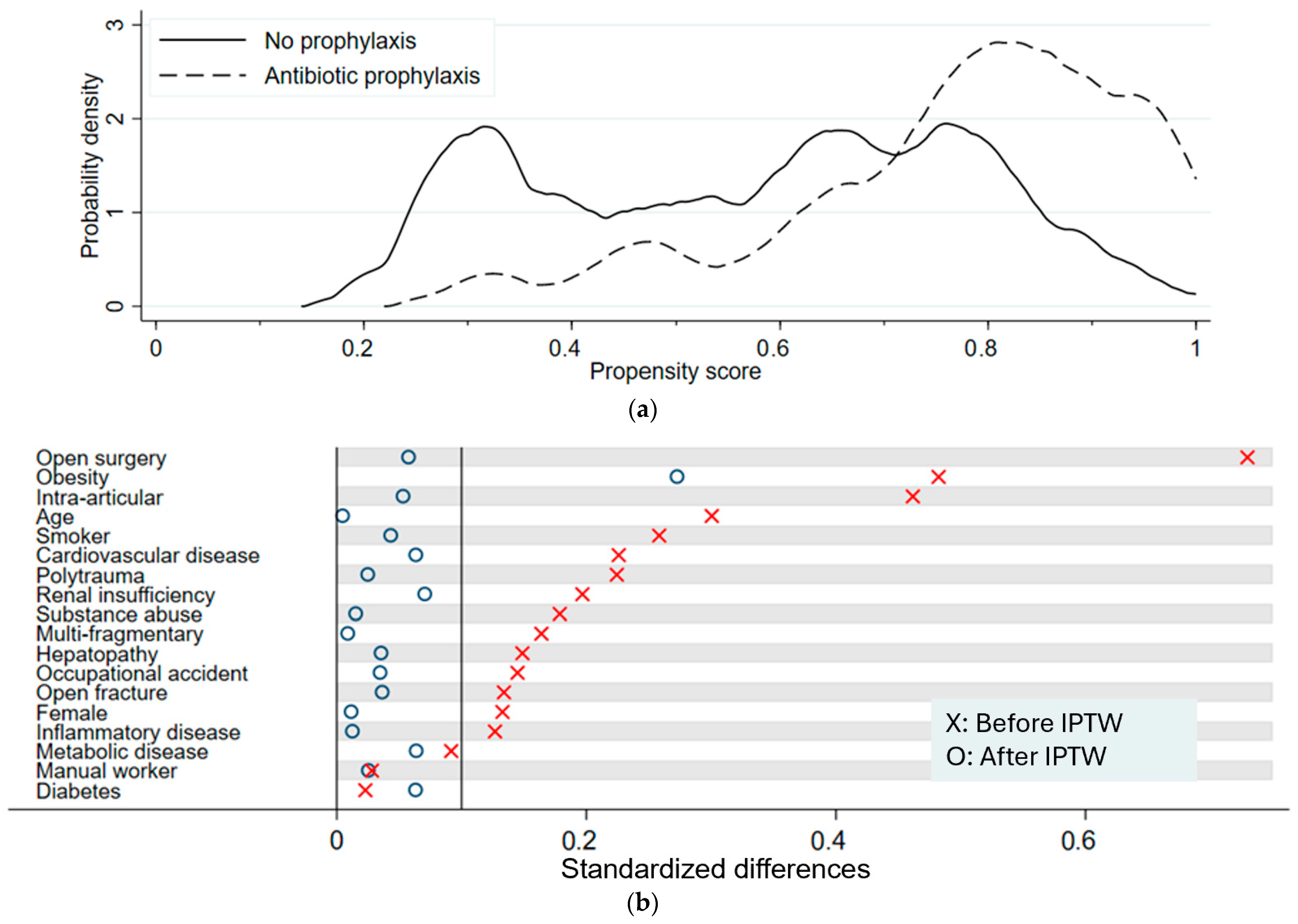 Figure 1a illustrates the distribution of propensity scores across the two groups. With the probability density on the y-axis, the graph illustrates the distribution of propensity scores across the NP and the P group. Overlapping graphs suggest balance between groups. The P group has a peak at propensity scores around 0.8, whereas the probability density of the NP is more evenly distributed, with three peaks at propensity scores around 0.3 and between 0.6 and 0.8. The divergence between the curves representing the two main groups indicates a certain imbalance in the probability of receiving antibiotics. These results show that certain subgroups are more prevalent in the P group and, therefore, were more likely to receive preoperative antibiotics. This imbalance reflects the underlying clinical decision-making, where patients with more complex injuries tended to receive prophylaxis.