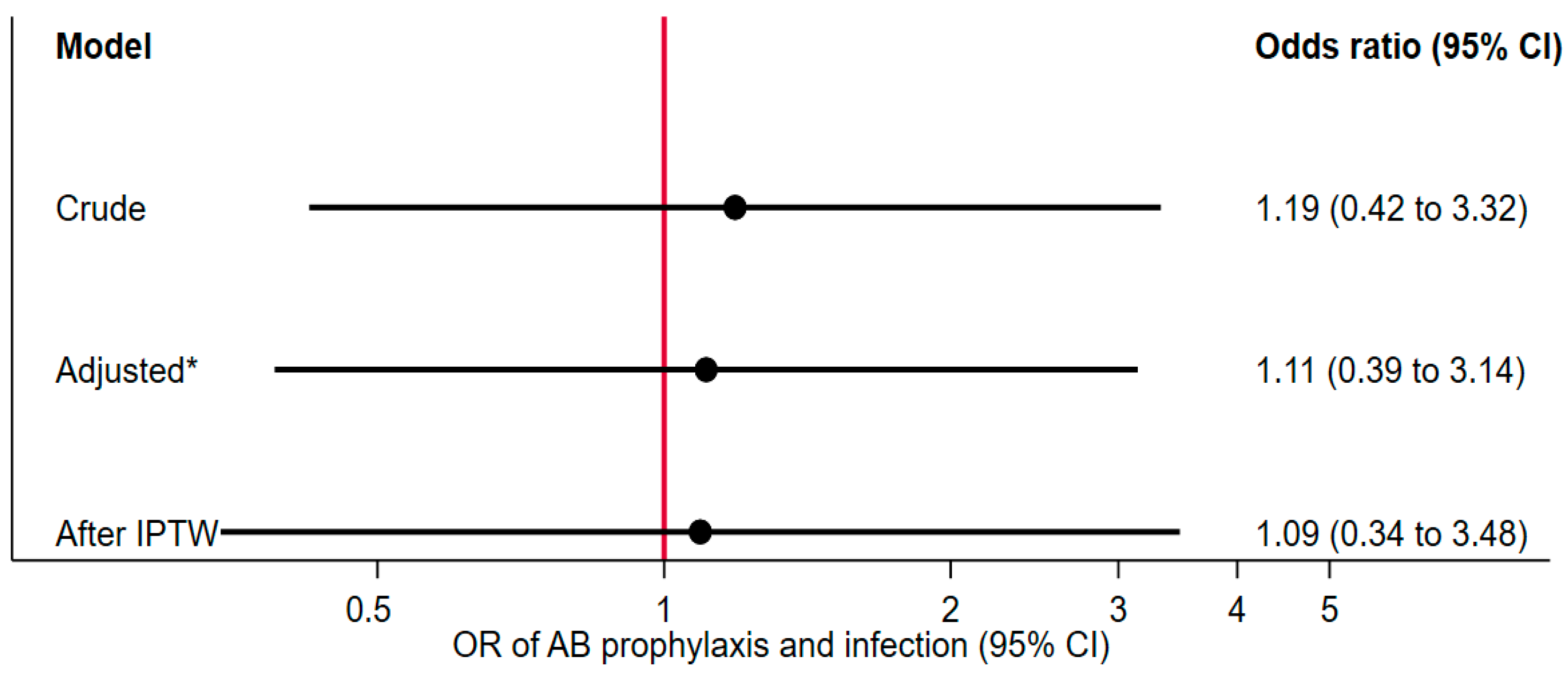 Figure 2 shows the odds ratio calculation with the associated 95% confidence interval (CI) before and after IPTW and after adjustment for age, being a manual worker, and cardiovascular disease. We did not find an association between the absence of preoperative antibiotic treatment and the postoperative infection rate. The crude OR was 1.19 (CI: 0.49 to 3.32), indicating that infection frequency was slightly higher in patients who had received preoperative antibiotic prophylaxis. Neither adjustment (OR = 1.11, CI: 0.39 to 3.14) nor IPTW (OR = 1.09, CI: 0.34 to 3.48) substantially altered the odds ratio. All confidence intervals crossed 1.0, indicating the absence of a statistically significant association.