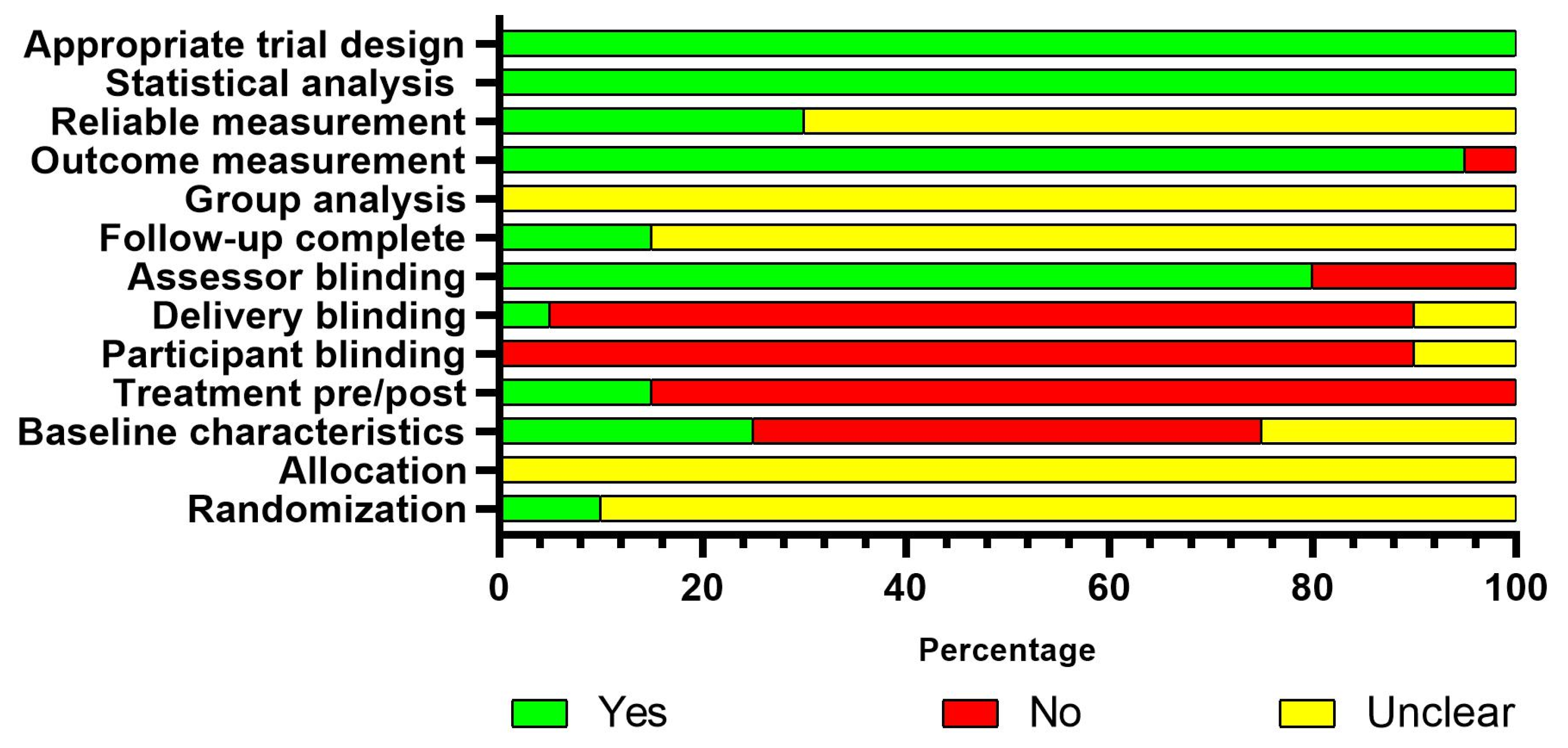 | Quasi-exp. | −19.76 | −1.25 | 31 | RE-SMD | −1.46 | 0.24 | −1.94 to −0.97 | <0.001 | 83.9 | <0.001 | |