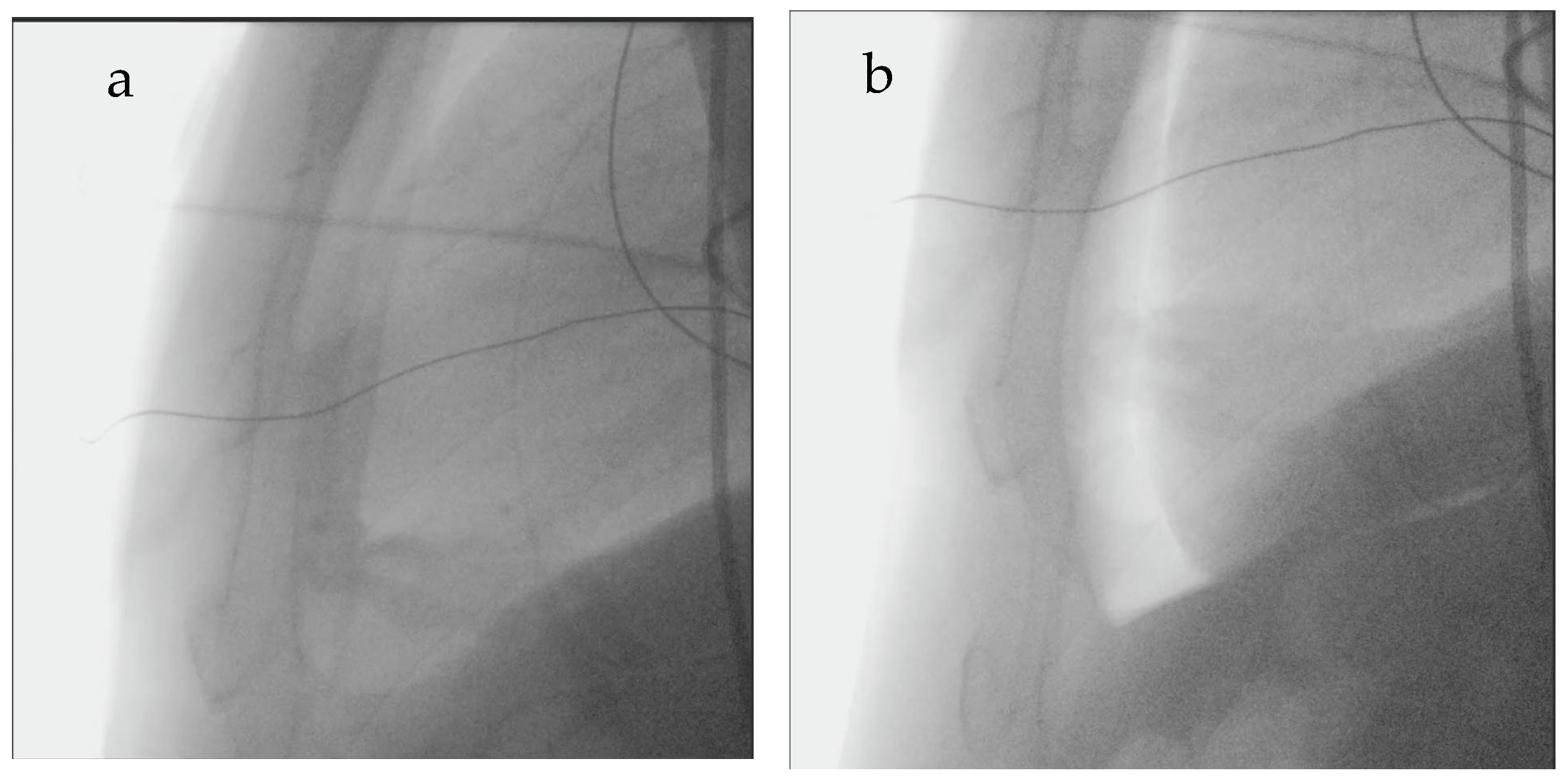 ® microcatheter (ASAHI INTECC Co., Ltd., 3-100 Akatsuki-cho, Seto, Aichi 489-0071, Japan) was advanced into the pericardial space. Contrast medium was injected before CO