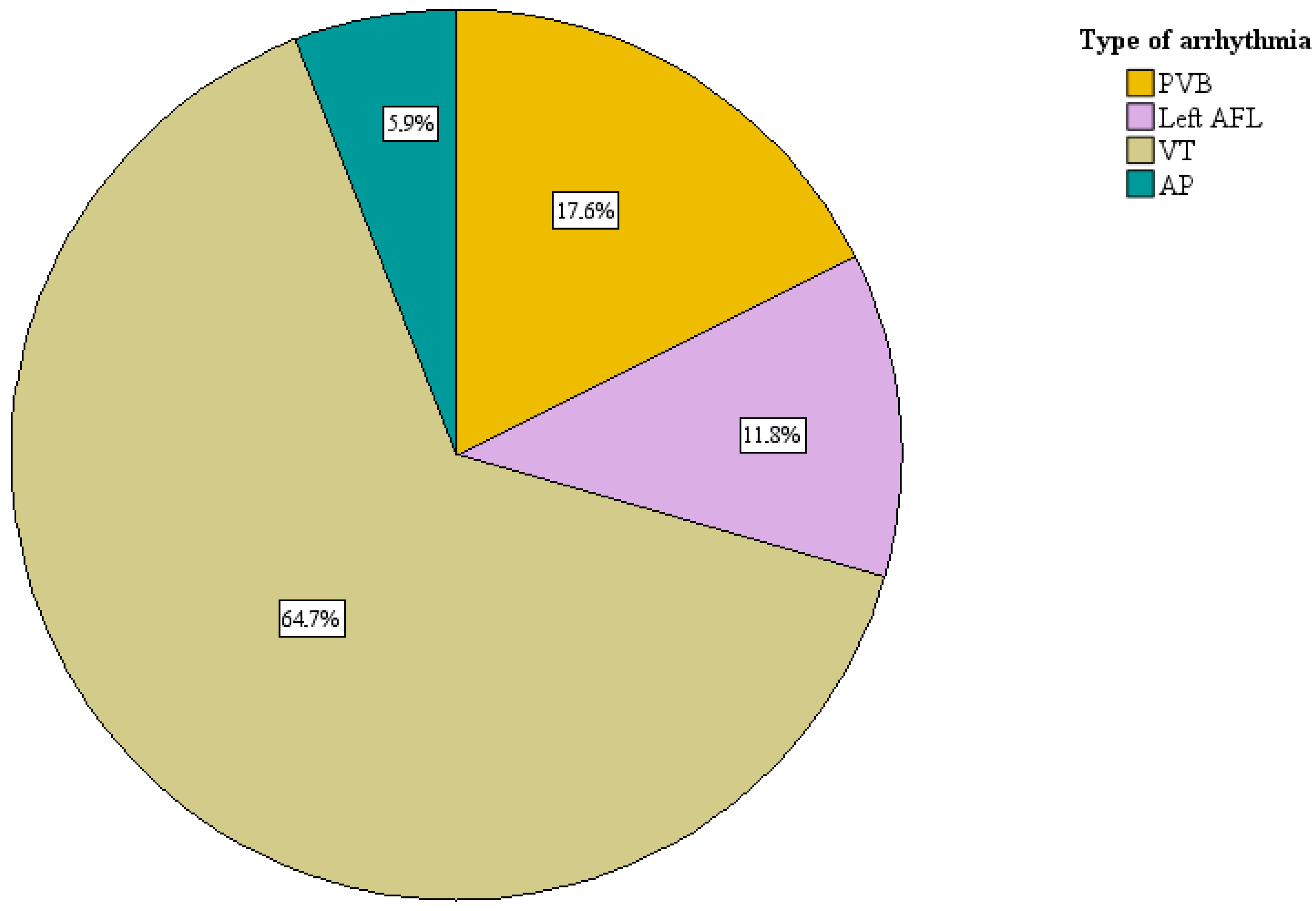 Among the 17 patients who underwent ablation, 16 (94.1%) achieved acute success. The patient who experienced acute arrhythmia recurrence was a VT, with the recurring episode occurring during the index hospitalisation for the ablation procedure.