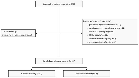 All consecutive patients aged 40–64 years scheduled for a primary cemented TKA for Ahlbäck grade III, IV, or V primary knee OA were screened (Figure 1). This 40–64-year range was chosen a priori to include a younger, working age cohort, and exclude very young (<40 years) patients who often have different underlying etiologies and activity expectations. Candidates had to present with unilateral OA, intact neurovascular status, and the ability and willingness to comply with the full one-year follow-up.