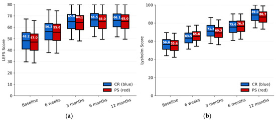 The primary outcome, 12-month change in the LEFS was similar between groups. Mean improvement was 17.74 ± 12.16 points in the CR cohort and 17.88 ± 12.28 points in the PS cohort. The one year between-group difference in change was 0.14 points (95% CI −3.80 to 4.08; p = 0.944, Cohen’s d = 0.01). In the CR group, mean LEFS increased from 48.20 ± 14.81 at baseline to 56.20 ± 14.84 at 6 weeks, 65.04 ± 12.83 at 3 months, 66.51 ± 11.84 at 6 months, and 66.14 ± 11.61 at 12 months (Figure 3a). In the PS group, LEFS increased from 47.09 ± 14.65 at baseline (p = 0.63) to 55.64 ± 14.65 at 6 weeks, 64.13 ± 12.90 at 3 months, 65.08 ± 12.46 at 6 months, and 65.02 ± 12.43 at 12 months. At all timepoints, between-group differences remained small (3 months: p = 0.67; 6 months: p = 0.47; 12 months: p = 0.60, −1.18 to −1.46 points, Cohen’s d = 0.08) and not statistically significant with all corresponding 95% CI crossing zero. Between-group differences in LEFS MCID improvement were minimal at all follow-ups (Table 3). Recovery favored PS slightly at 6 weeks (+0.57 points; p = 0.113), but differences at 3, 6, and 12 months were small and nonsignificant. MCID achievement rates were also similar between groups.