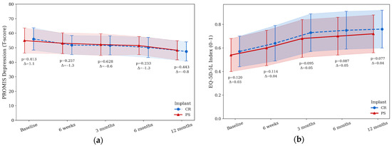Patient reported quality of life and mental health outcomes after TKA in both groups. (a) PROMIS Depression T-scores over time for patients receiving posterior-stabilized (PS, triangles, solid line) or cruciate-retaining (CR, circles, dashed line) TKA; (b) EQ5D5L mean index over time. Data are presented as mean ± standard deviations. p-values indicate group comparisons at each follow-up timepoint.