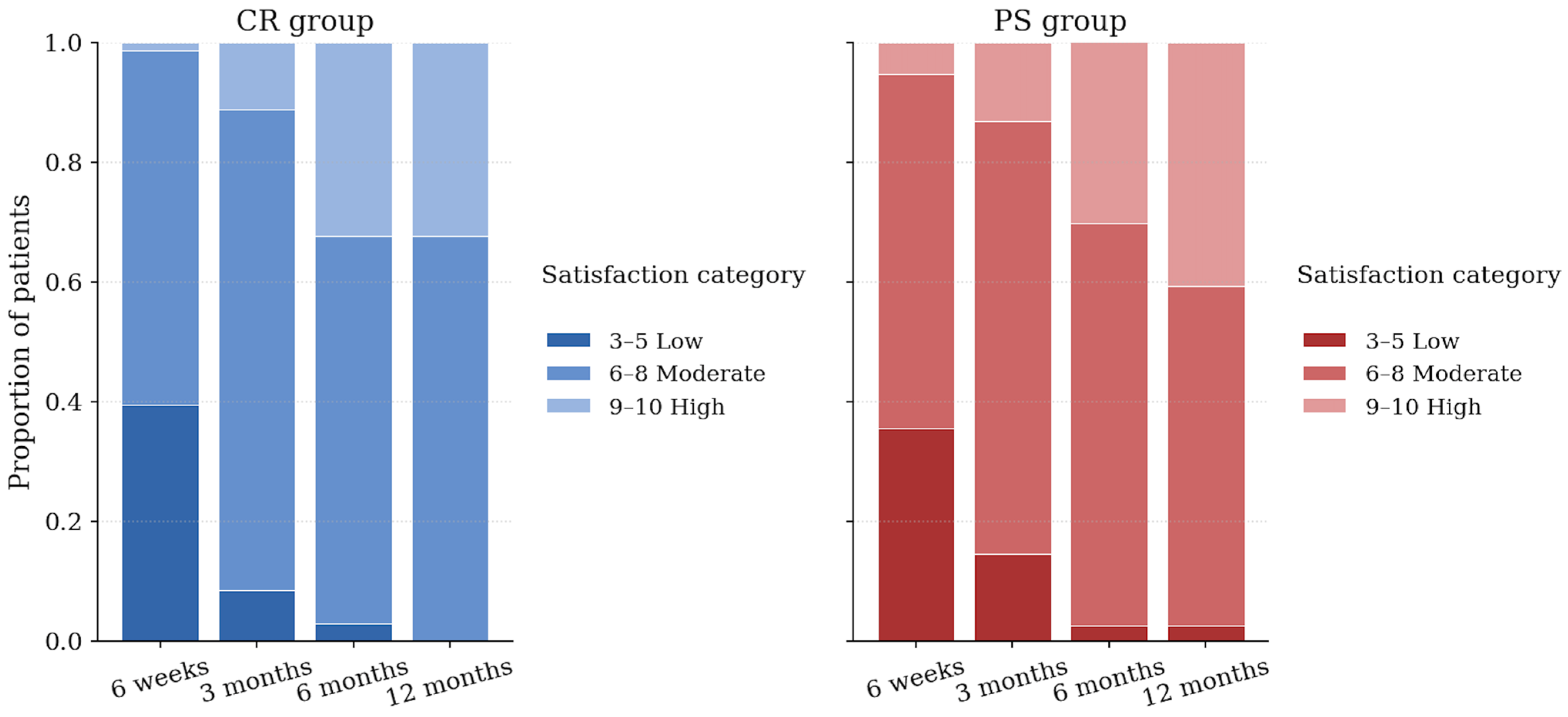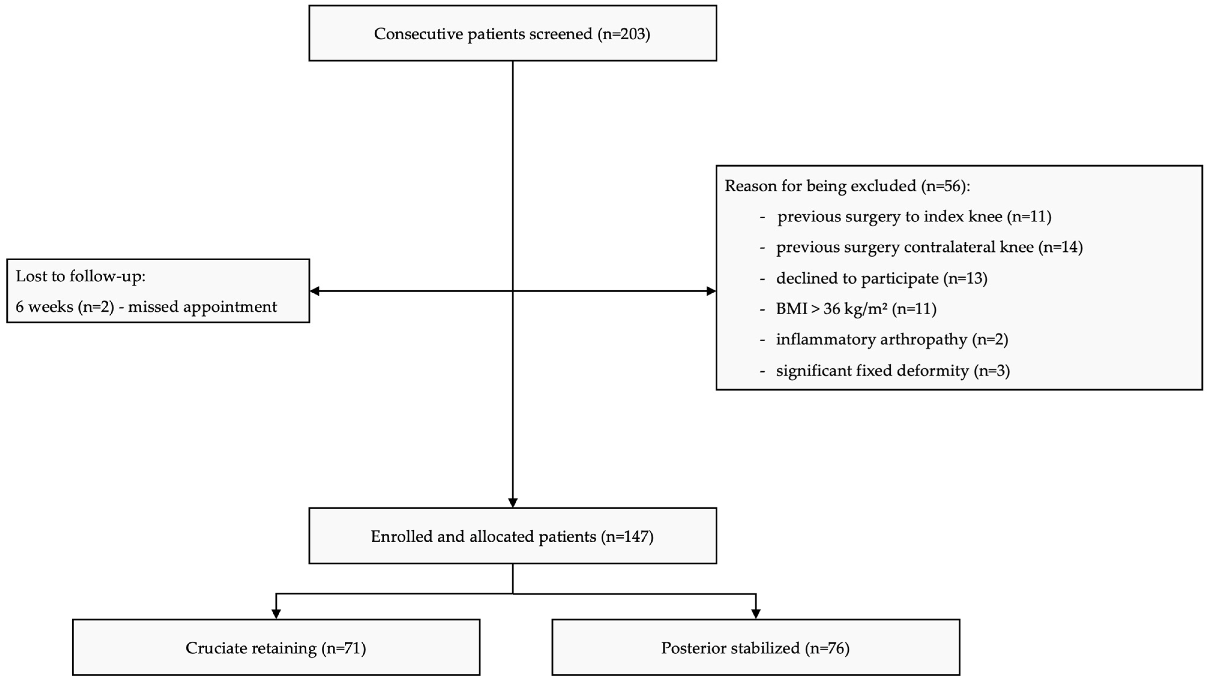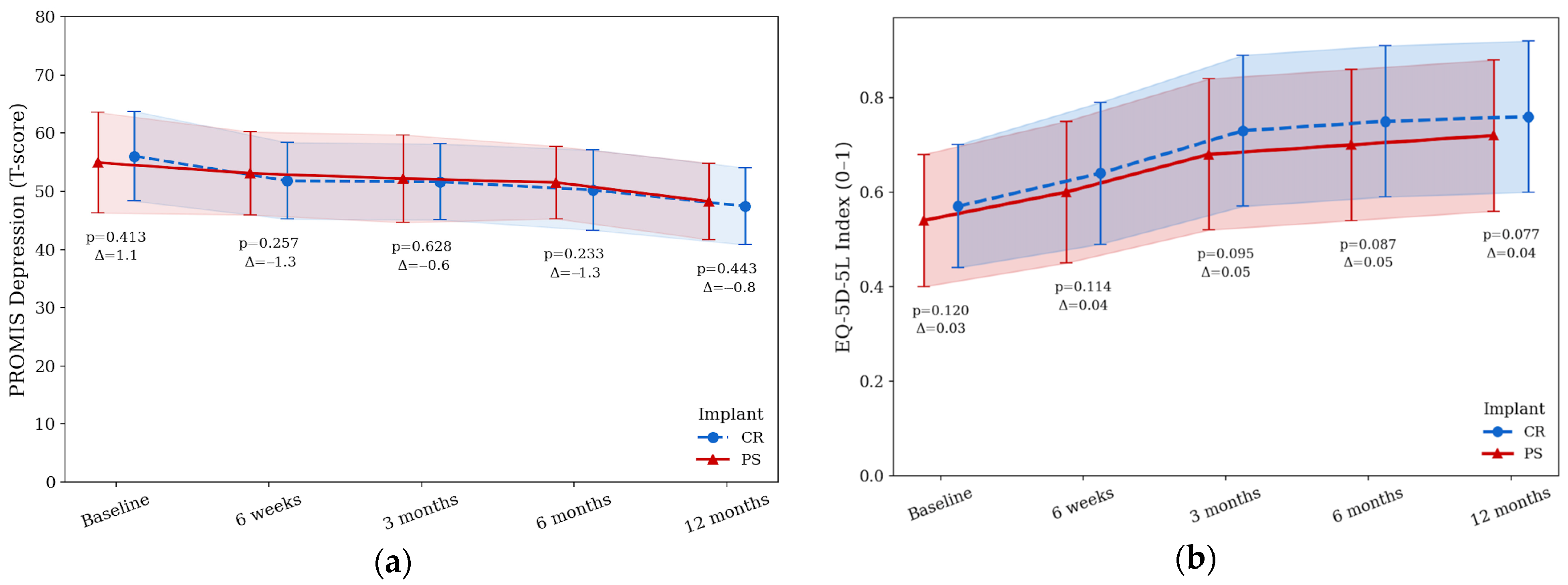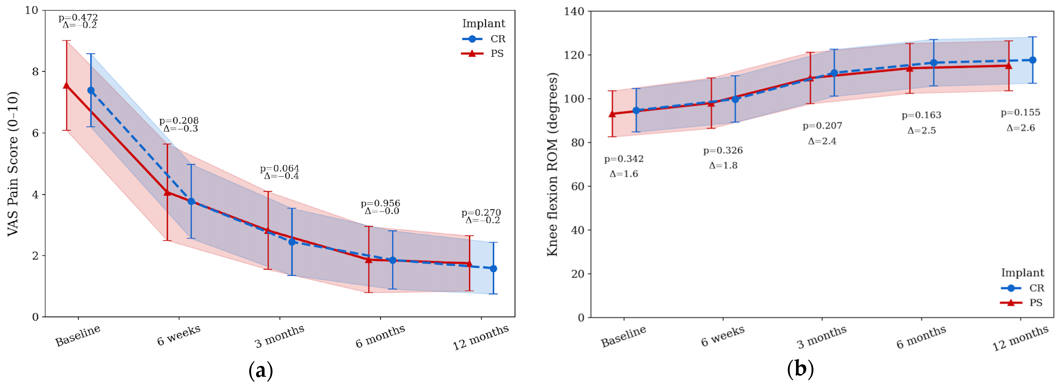 - Tille, E.; Beyer, F.; Lützner, C.; Postler, A.; Lützner, J. Better Flexion but Unaffected Satisfaction After Treatment with Posterior Stabilized Versus Cruciate Retaining Total Knee Arthroplasty—2-year Results of a Prospective, Randomized Trial. J. Arthroplast. 2024, 39, 368–373. [Google Scholar] [CrossRef] [PubMed]
